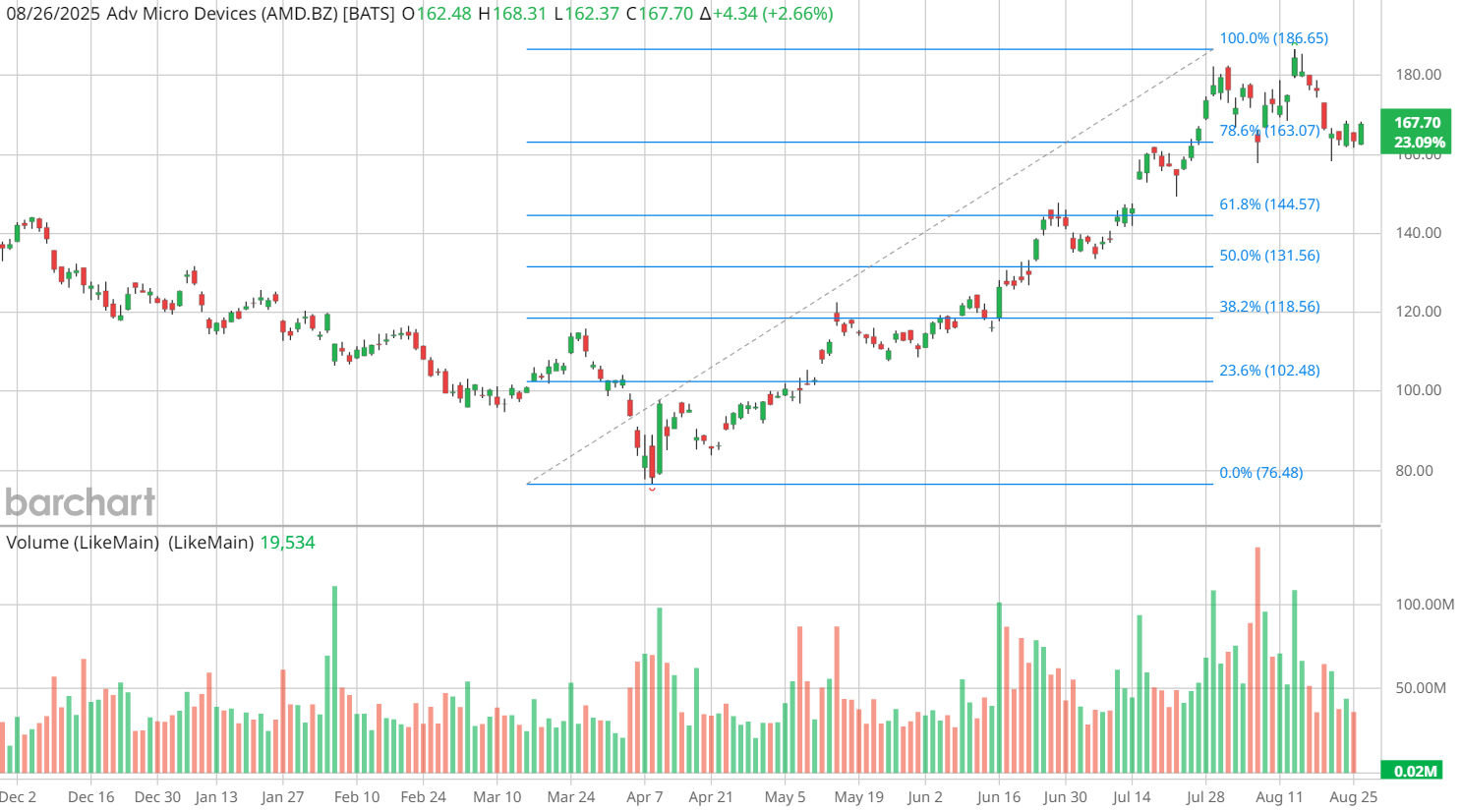 AMD has recently been consolidating around a 78.6% Fibonacci retracement of its recent high and low, with the shares up a staggering 113.6% since April. The semiconductor stock is still trading down about 28% from its all-time highs, set in March 2024.