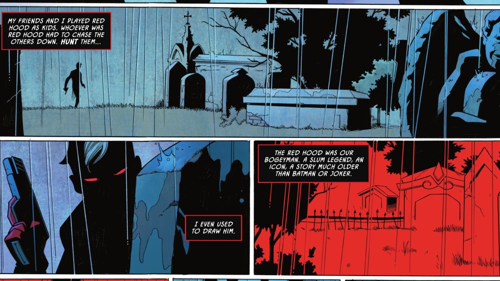 Jason recognizes that Joker was Red Hood, but remembers that the ‘Red Hood’ is a Gotham urban legend that dates back decades. A bogeyman-like figure who lurks in the shadows and strikes when people least expect it. Jason even remembers that when he was a boy, he used to play as the Red Hood with his friends, and even drew himself as the shadowy figure. While Jason succumbs to his injuries in the final fight, he finds comfort in the fact that he’s not Joker’s legacy, but rather, his own person who became the hero he wanted to be.