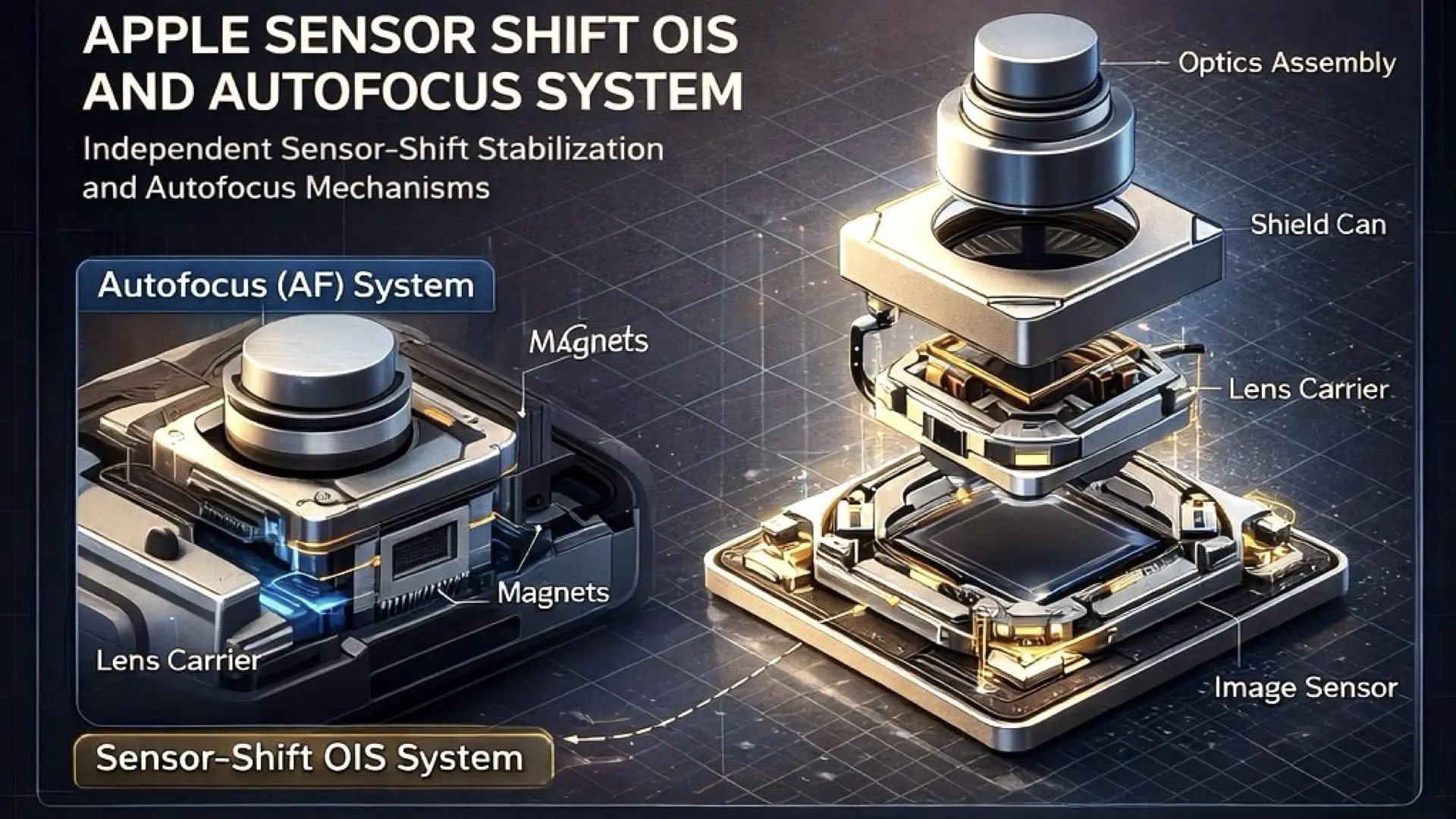 US 12,498,537 B1 focuses on how the camera module is physically constructed. The key idea is separation. Apple is clearly dividing autofocus and stabilization into two distinct mechanical systems that are designed not to interfere with each other. Autofocus is handled by a lens carrier that moves along the optical axis. Sensor shift stabilization is handled by a separate platform that moves the image sensor itself. These systems are no longer sharing motion paths or structural compromises. This is not about adding more movement but controlling movement more precisely.
