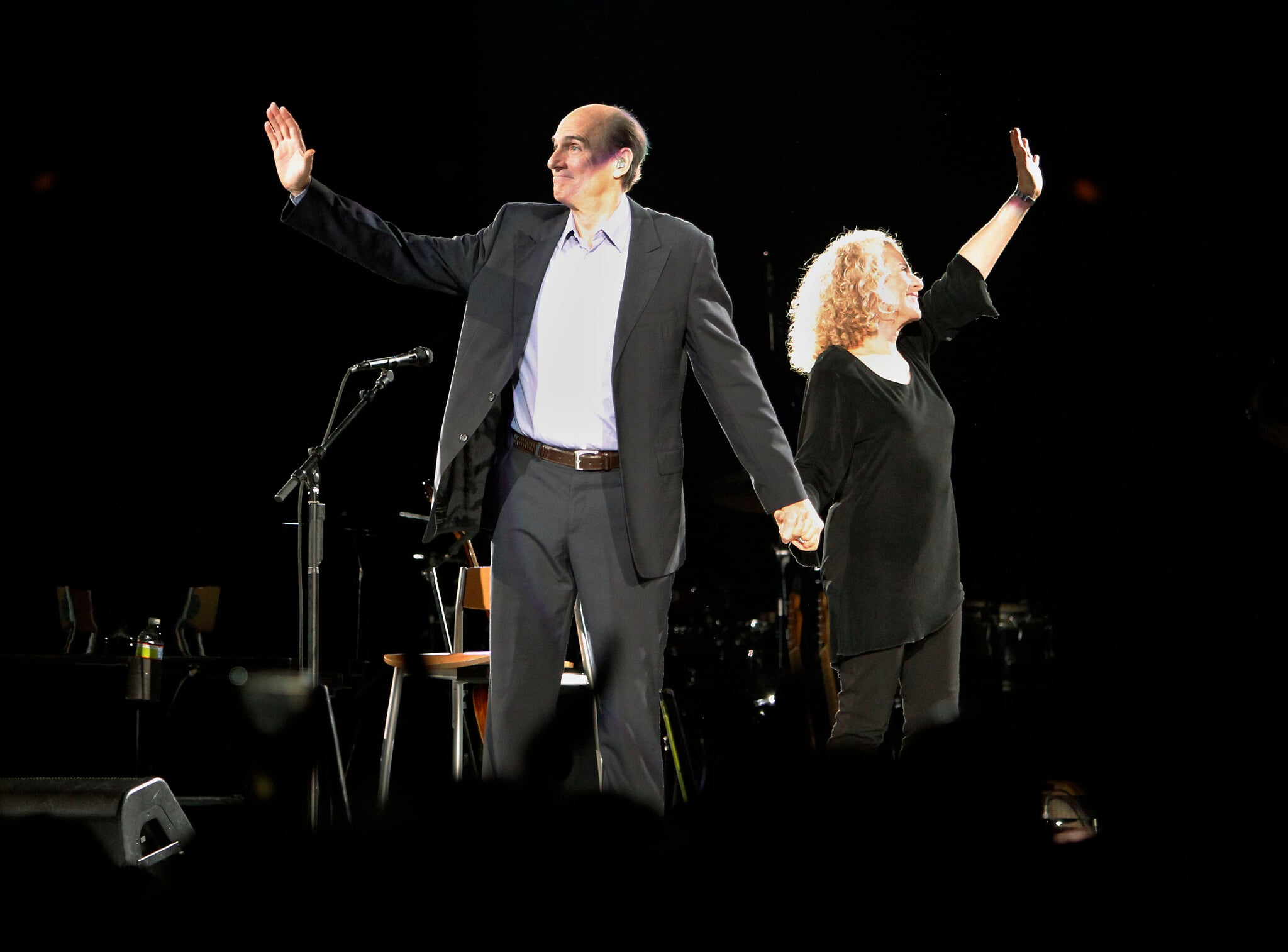 James Taylor, left, and Carole King wave to the crowd as they take the stage to perform at the last event scheduled for Mellon Arena in Pittsburgh, June 26, 2010. (AP Photo/Keith Srakocic)