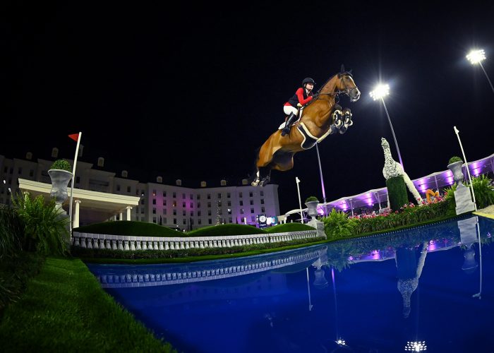 Her expression and presence are always striking, and I usually want to zoom in on her as tight as possible,” Long said. “But for this one I took the opportunity to include more of the atmosphere of the grand prix ring. The flags and palm trees with mountains in the distance are defining features of the venue, and the lavishly decorated jumps made the foreground equally beautiful. I felt that the resulting photograph appropriately conveyed the scale and ‘spectacular’ quality of the sport, the venue, and the horse in this moment.
