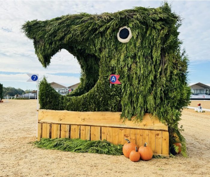 West Coast-based photographer Tina Fitch traveled cross-country to help colleague Shannon Brinkman cover the Mars Maryland 5 Star at Fair Hill in October. When she was walking the cross-country course and saw a pair of giant brush, keyhole corners, artfully made into extravagant topiary animals, set up at Fence 7ABC, the Chesapeake Beasts and Bay Bridge, she saw an opportunity for a truly unusual shot.