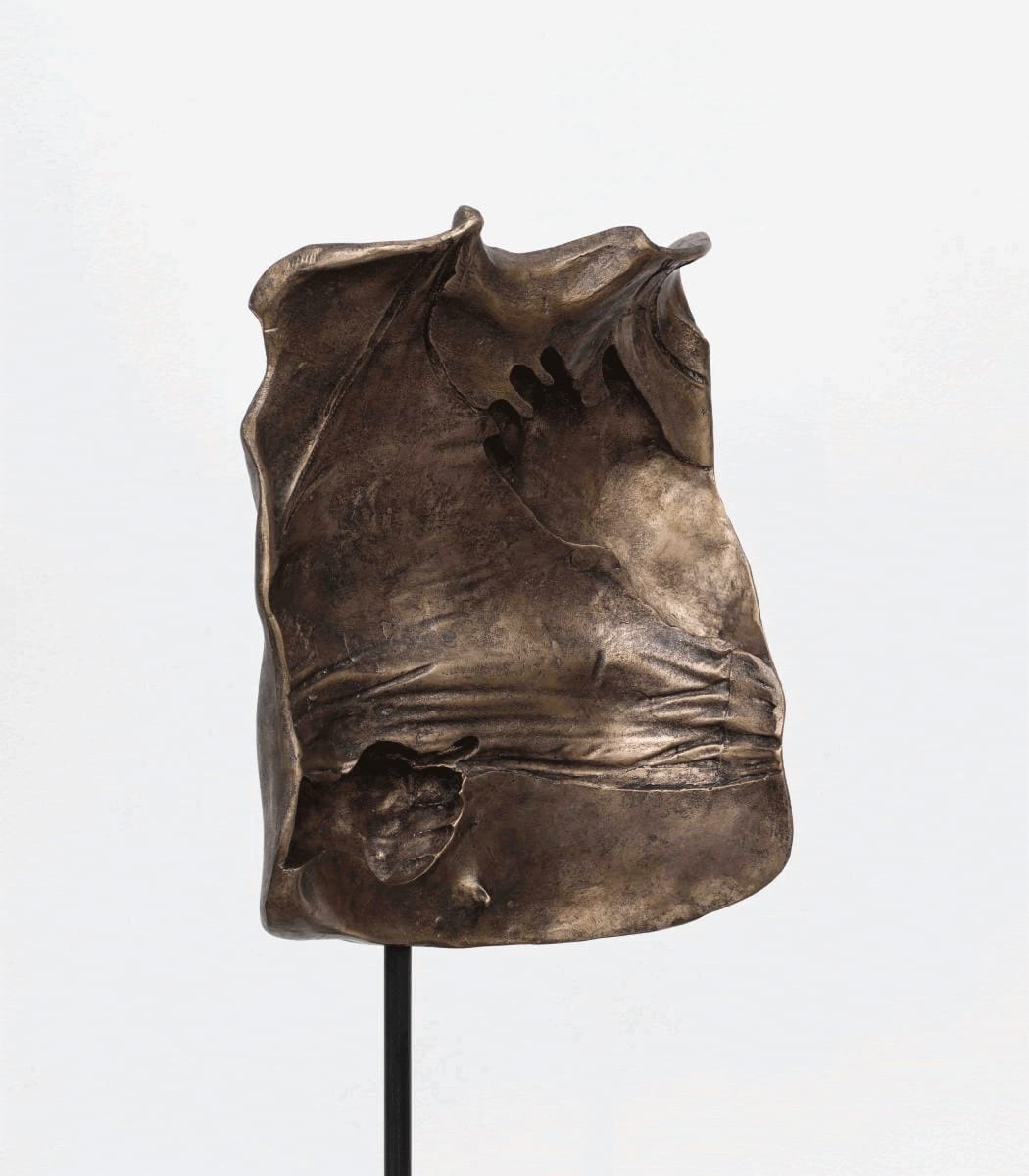 In poetic gestures that bear the trace of human experience, Young Joon Kwak creates alternative representations of queer and trans embodiment. This bronze, included in their solo exhibition at the Leslie-Lohman Museum in New York City this year, belongs to a series of evocative cast portraits of the artist’s friends and collaborators. The sculpture’s convex side depicts studio assistant Charlie’s chest after top surgery, while the concave surface shows his chest pre-surgery, wearing a compression garment known as a binder.