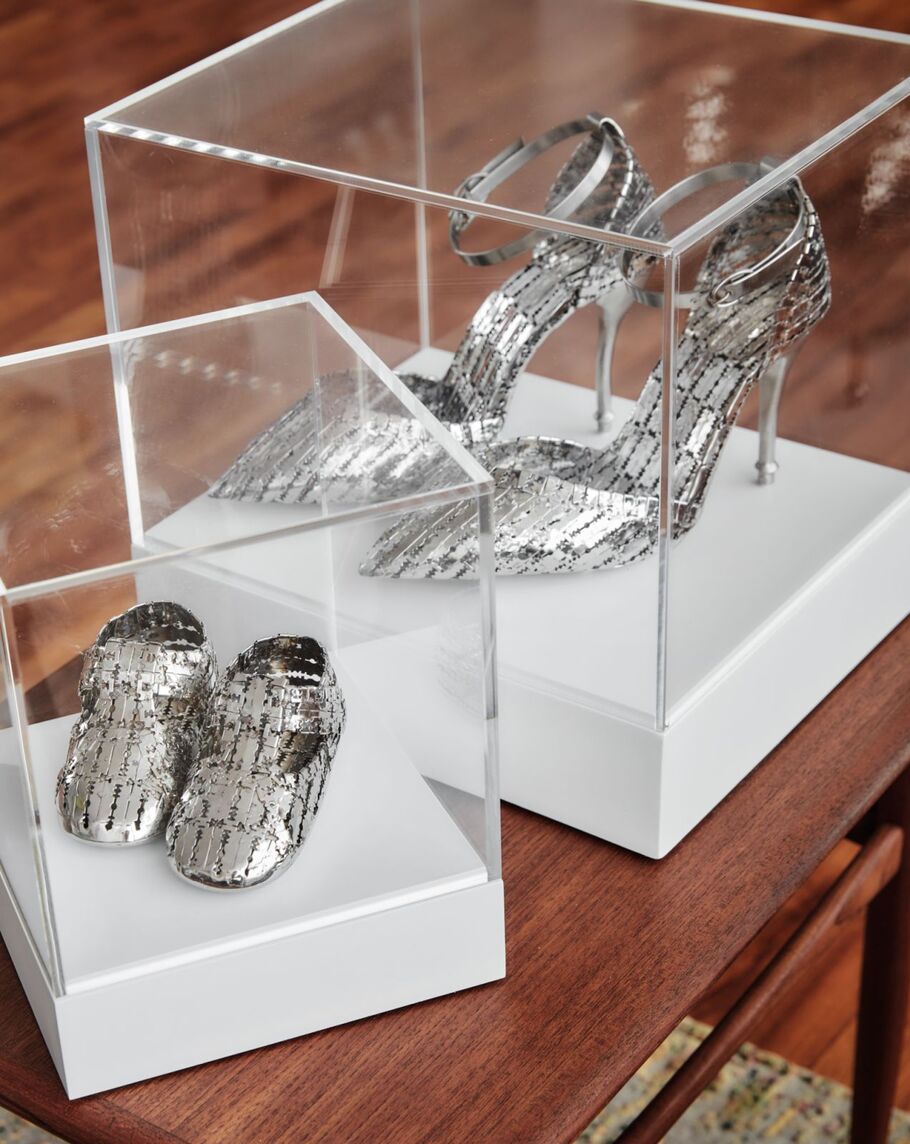 Nearly a decade later, in her living room, sit two glass-encased works by Lipi: a pair of palm-sized baby shoes—Lost (2019)—and a set of stiletto heels—Her Stilettos 1 (Day) (2019)—both cut from the glint of razor blades.