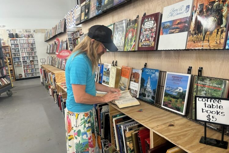 George Brooks inspects a bookThen, there are the books, records, and other merchandise. They work with junk haulers, movers, estate sale companies, 42 libraries, and dozens of schools to get a steady stream of donations and keep books out of landfills.