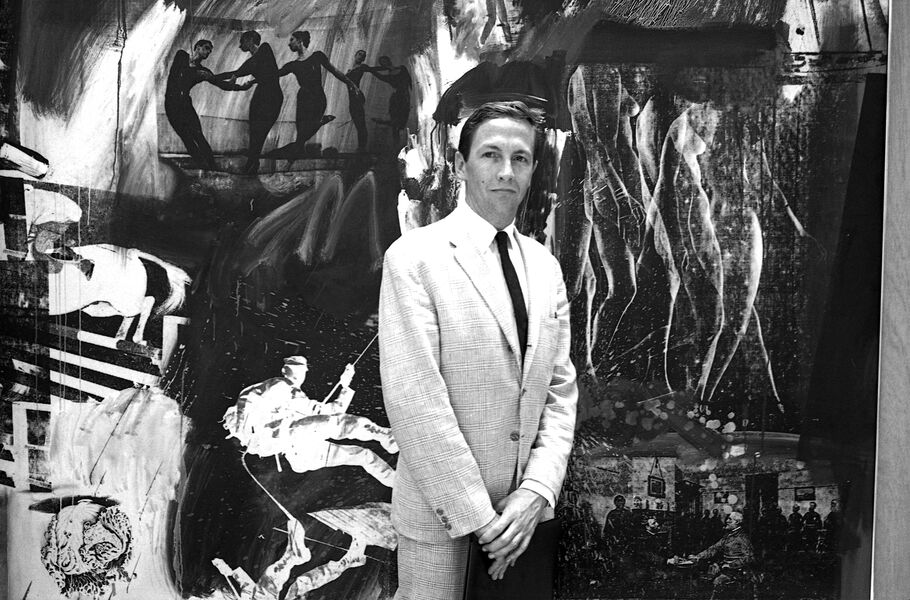 Portrait of Robert Rauschenberg in front of his silkscreen painting Express at the XXXII International Biennale of Art Exhibition, Venice, 1964. Photo by Ugo Mulas. © Ugo Mulas Heirs.