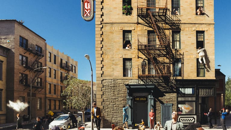 Next came casting the characters that make up the scene. “Anything that we could come up with, we were just like throwing it at the canvas,” Krug said. A couple kiss in a window. A man fights a parking ticket in the foreground. Djo is seen only from the back, dangling from a window in a white suit.