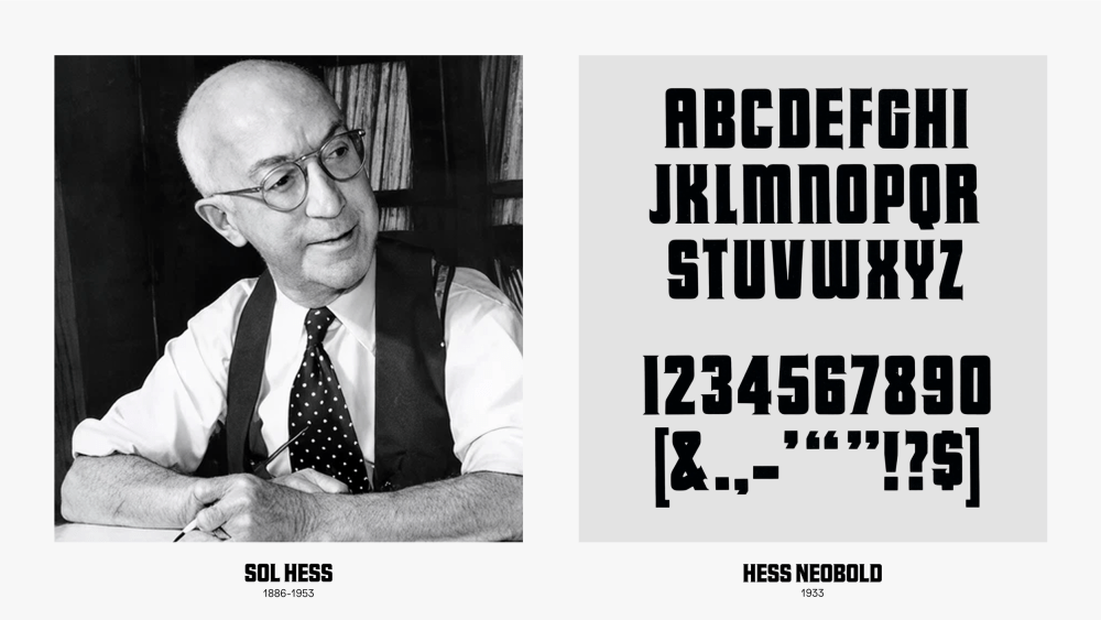 Hess Neobold font, 1933. An American typeface combining industrial and classical qualities, cut by typeface designer and art director Sol Hess (1886-1953). Hess was a lifelong resident of Philly, and studied at the PMSIA for three years and became Frederic Goudy’s successor at Lanston Monotype.