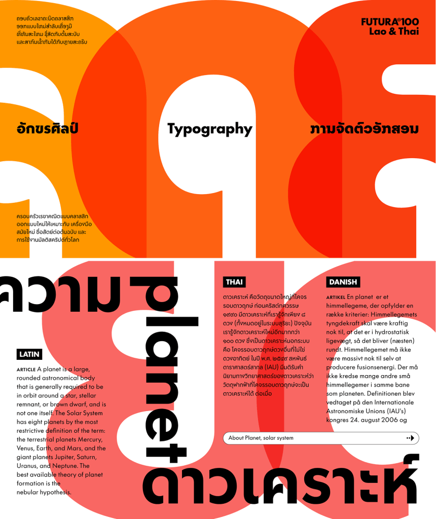 Now, a century later, TypeTogether’s Futura®100 extends that legacy across a world that Renner couldn’t have imagined. The project currently spans twelve scripts (with eleven more to come) covering more than ninety percent of the world’s population. Each script has been designed with native consultants, typographers, and proofreaders to ensure accuracy and cultural fluency. Burian notes, “For every script, given the importance of this project, we had additional consultants for each script. So it’s not just a designer, but also another pair of eyes who is native in the language. It’s a check and balance.”