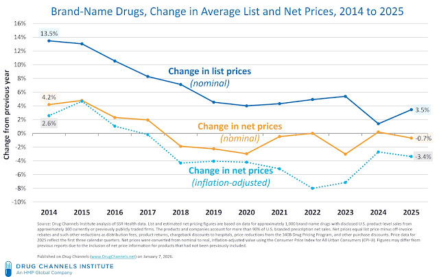 Over the past two years, however, average brand-name list prices have been below 4% annually. And based on initial data for 2026 from 46brooklyn, list price growth will be 4.0%. (I suggest you monitor 46brooklyn’s valuable Brand Drug List Price Change Box Score.)