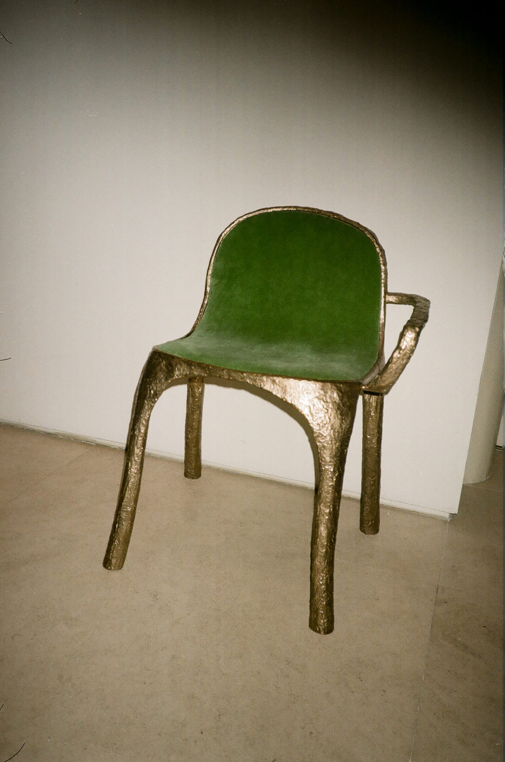 “This is a David Wiseman bronze chair. All of his work is related to nature. The upholstery that you see is imitating a body of moss. This almost looks like a branch and then there’s a little signature on the back, a little fish here. We’ve been working with David for a while, but one of the things that I love about his practice is how artisanal it is, and everything is made in his studio in Frogtown, L.A. He has his own foundry and does all of his porcelain work there. And he has this beautiful garden that’s part of the inspiration. It’s a very singular chair, but a lot of the work is lonely.”