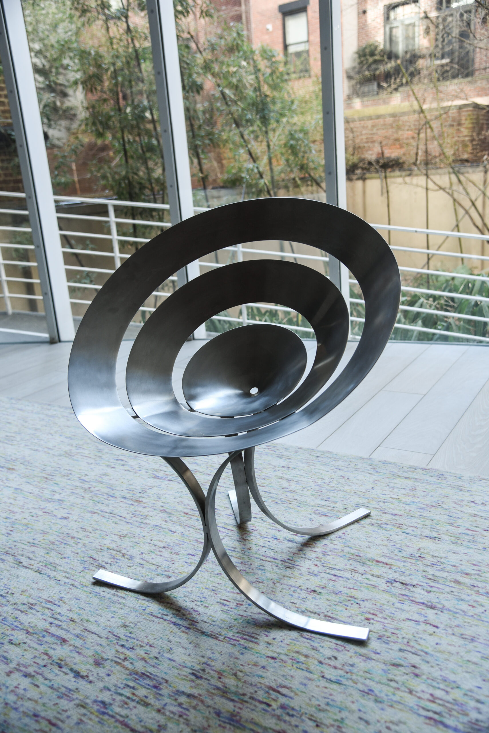 “This Maria Pergay chair is new. We just started working with her estate a few months ago. The rings either come in threes or fours. One of the famous stories of Maria Pergay is that she got the idea of this ring chair by peeling an orange for her son. I always love this idea of being inspired by a simple domestic activity. The way I learned the story was through A.I. I asked it, Can you tell me a story about Marie Pergay as a mother that relates to her design? and that’s the story it gave me. I love asking it kooky questions.”