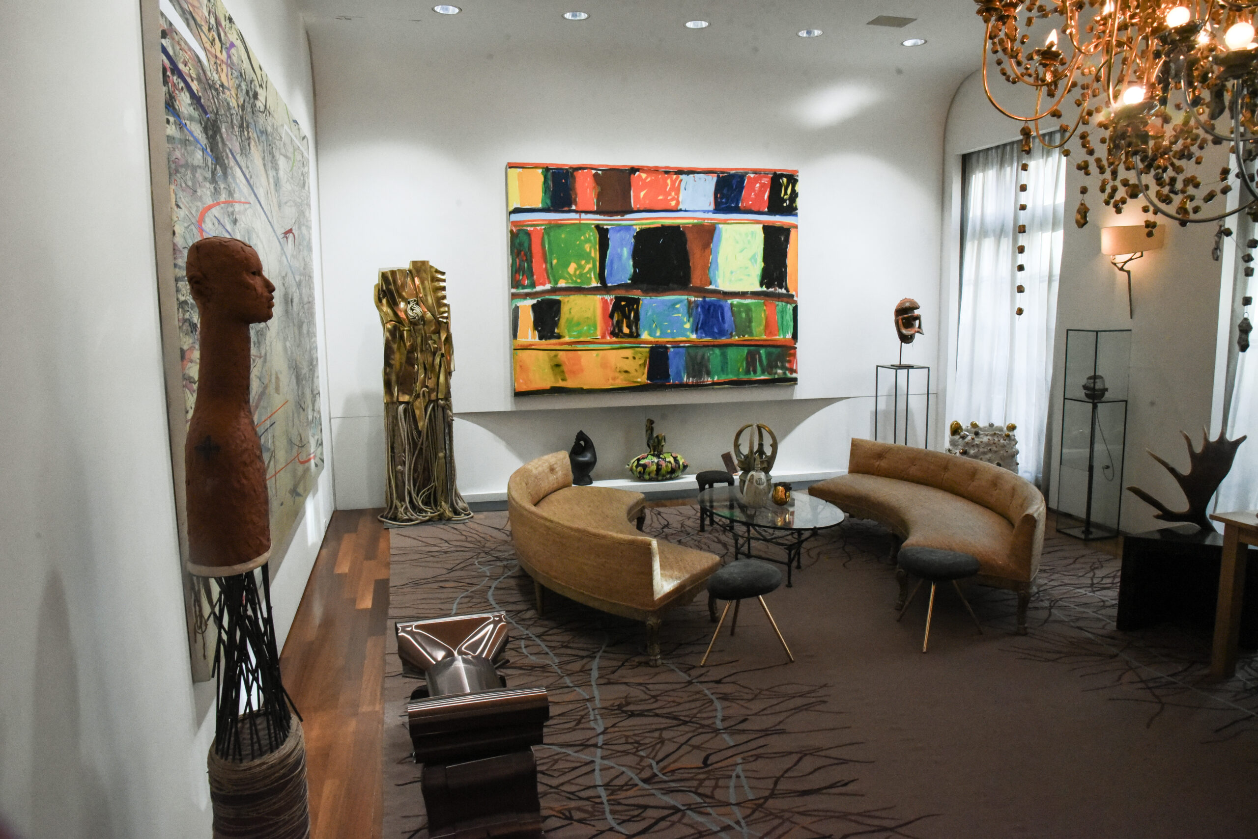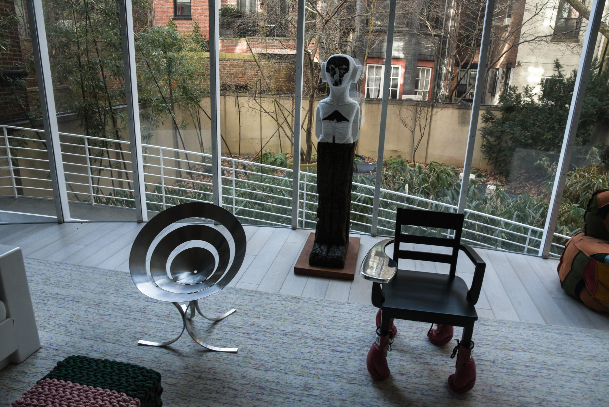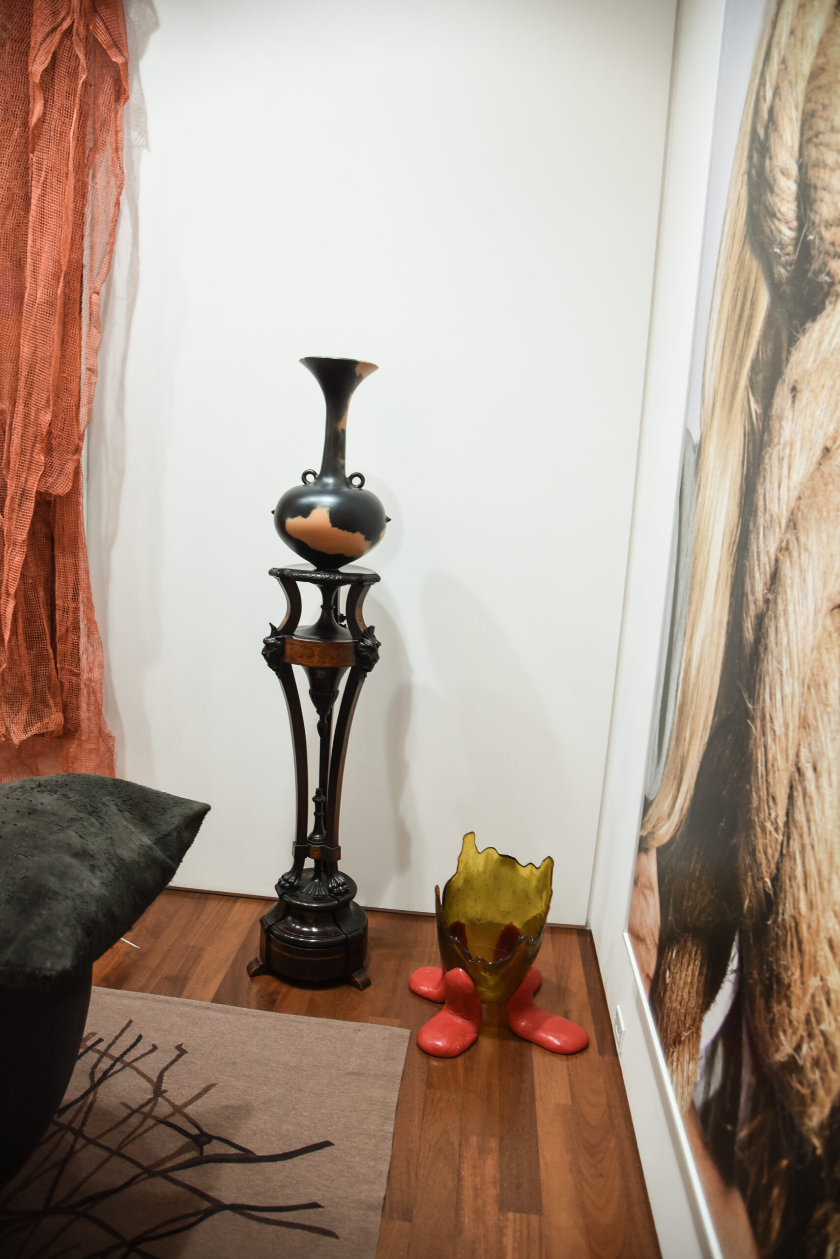 “This space is just a small laboratory where I can do that. A lot of people will say, Pesce, oh, my gosh, you can’t put that with anything. He’s a radical designer. But it’s my job to take these things and put them together and say, No, they can coexist in a space. Look at the different textures and materials. You have different processes. You have resin, which is a poured process which is very quick, whereas the Odundo vase is literally years of work and practice. She builds her ceramic vessel through a coil-based work, and then a burnishing. The impossibility of hand-making a vessel with this beautiful tall neck–I mean, talk about anthropomorphic. It’s almost like a woman with her hands on her hips. You’ve got these wonderful nipples or belly buttons. You know it’s holding something special inside. You just feel how special this is as being a female, as a vessel, and the handmadeness and every detail on it. The other thing is, when I talk about different attitudes–something that has humor, something that’s very serious, something that’s lonely–we want to cover all of the emotional spectrum when we’re looking at art. You don’t want it all to have the same measure, or the same volume. I want to have things that represent different emotional states. When Pesce gave it to me, I just plopped him in the corner, and he’s stayed there ever since. But feel him. Feel it. It’s silicone. It’s soft, but it looks like it’s supposed to imitate glass, which is really funny as well. Well, that’s the other thing with sculpture, a lot of it is meant to be touched. I have objects that you can touch, you can sit in, you can put flowers in. But the Odundo is clearly ceremonial. I want you just to look at it. I want you to be able to look around it, I want you to be able to experience it, but I don’t want you touching it.”