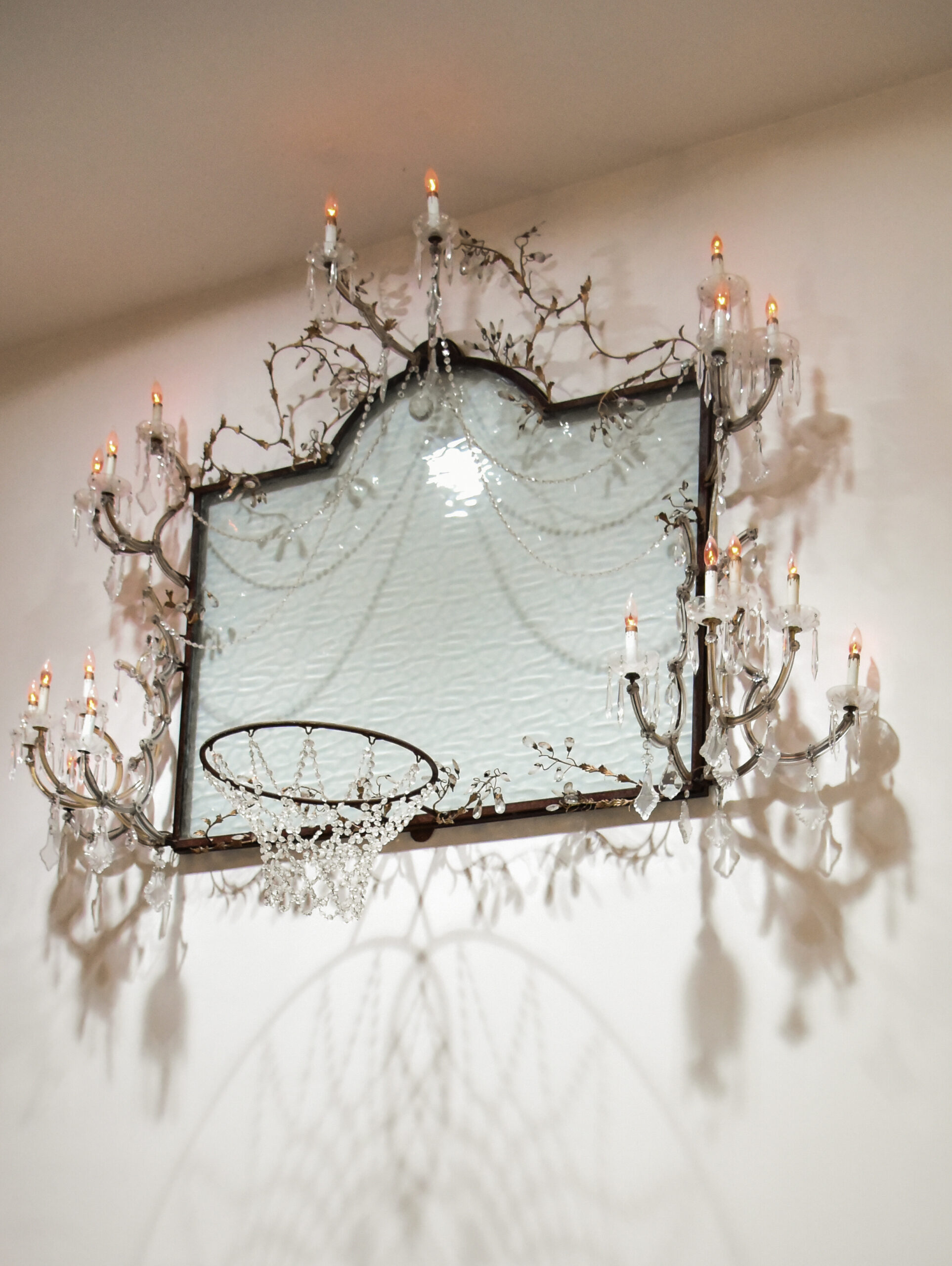 “This is the most iconic piece in the house, don’t you think? It’s actually the first work of art that we put in here. David [Hammons] chose it when we were building the house. It’s called Basketball Chandelier. He sat right there [gestures to couch] and there were these riggers, these guys with these big hands. But they couldn’t quite get a handle on where to grab on to the basketball because there’s all this other stuff there, and he was directing them where to go. It was great. I wish I had pictures of the installation day. It must have been 23 years ago. He did a big show with Hauser & Wirth, but he’s the OG of self-representation. In fact, he famously put a basketball chandelier himself into auction.”