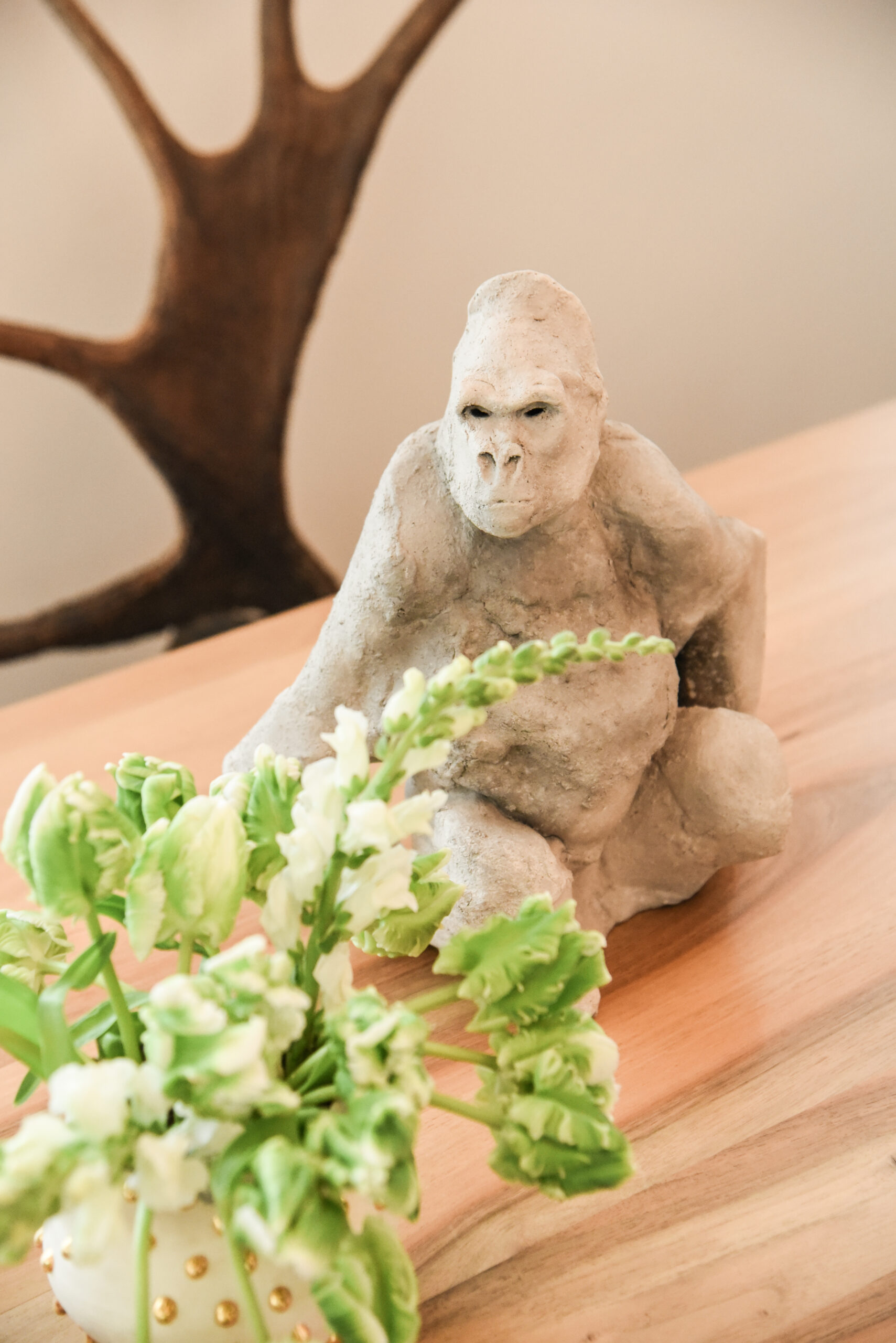 “The gorilla by Daisy Youngblood is very much about being alone–or being alone and facing a gorilla in nature. It’s about mortality in a sense. It’s is so otherworldly and human, and yet so much a gorilla. It’s kind of anthropomorphized. I’ve always been in love with Daisy Youngblood. She doesn’t make that much work, so I pursued finding the exact one that I wanted for many years. He’s amazing, very human. But is he very gorilla? Or are you just reading into it because a gorilla is part-human? What’s so uncanny about it is, you’re never face to face with a gorilla, but I imagine if you were, that gorilla might look like this. Is that a good way describing it? You definitely feel your own mortality next to it. It’s called Little Gorilla, but it’s got such a huge presence in my world.”