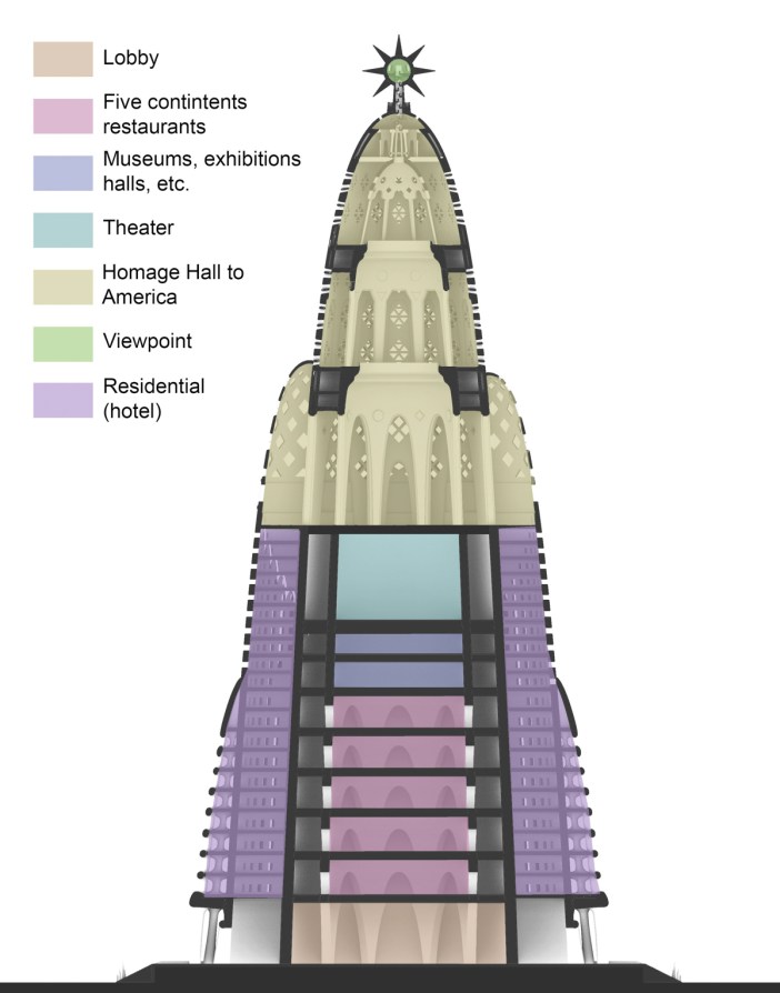 Gaudí’s sketches revealed a massive hotel with restaurants, museums, and even a theater. The upper section was dedicated to the “Homage Hall to America”, celebrating the achievements of the rapidly developing United States. The star atop the building was intended as a viewing platform.