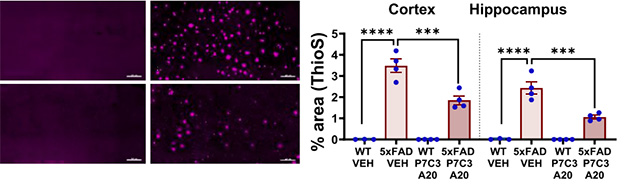 Plaque Preventor. Thioflavin-S staining (magenta) of 12-month-old wild-type (left column) and 5xFAD (right column) mice; P7C3-A20 treatment (bottom row) led to fewer plaques in the cortices (left graph) and hippocampi (right graph) of AD mice. [Courtesy of Chaubey et al., Cell Reports Medicine, 2026.]