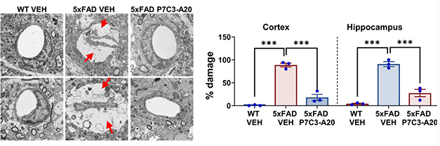 - P7C3-A20 reversed pathologic changes in plaque, phospho-tau, blood-brain barrier structure, synaptic function, and behavior assays.