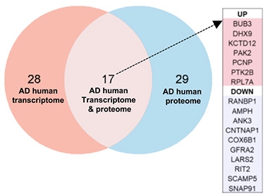 A subset of 17 proteins also showed matching changes at the transcriptional level in AD human brains (image below).