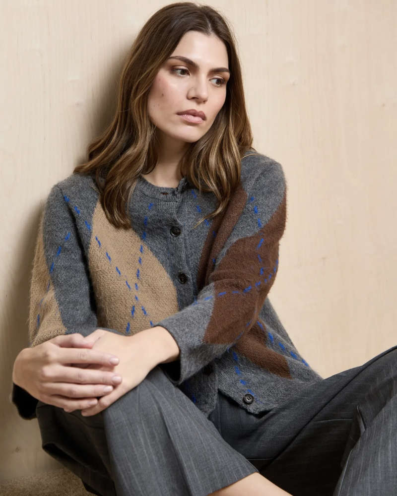 “Its traditional argyle pattern adds an eye-catching touch, while relaxed dropped shoulders and ribbed trims provide a casual finish.