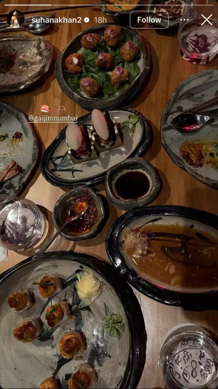 On the Instagram story posted by the actress, Khan gave a glimpse of her sushi date, which she had in Gaijin, Mumbai. She visited the restaurant with her cousin, Alia Chhiba, and their mutual friend, Manavi Gaur. Suhana posed with sushi in one of the snaps posted by Chhiba, who also gave a glimpse of the dazzling ambience of the restaurant. Khan reshared the collage of photos, where the three girls were seemingly posing in their dressing room, where a stack of shoes behind them. Taking out of the group chat, the three indeed had twinning outfits, where Khan wore a sleek halter neck dress, Alia wore a floral dress, and Manavi complemented the fit check with a rolled black shirt.