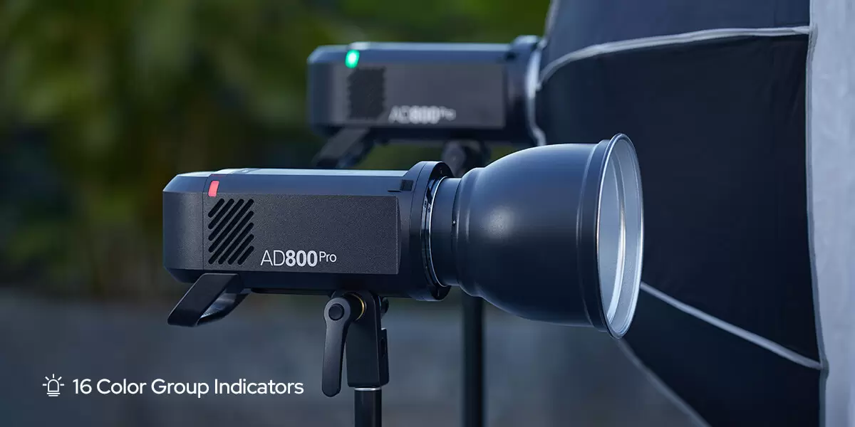 The AD800Pro features a high-resolution color display, a 40W bi-color modeling lamp for accurate previewing, and 16 color-coded group indicators for quick visual confirmation when working with multiple lights.