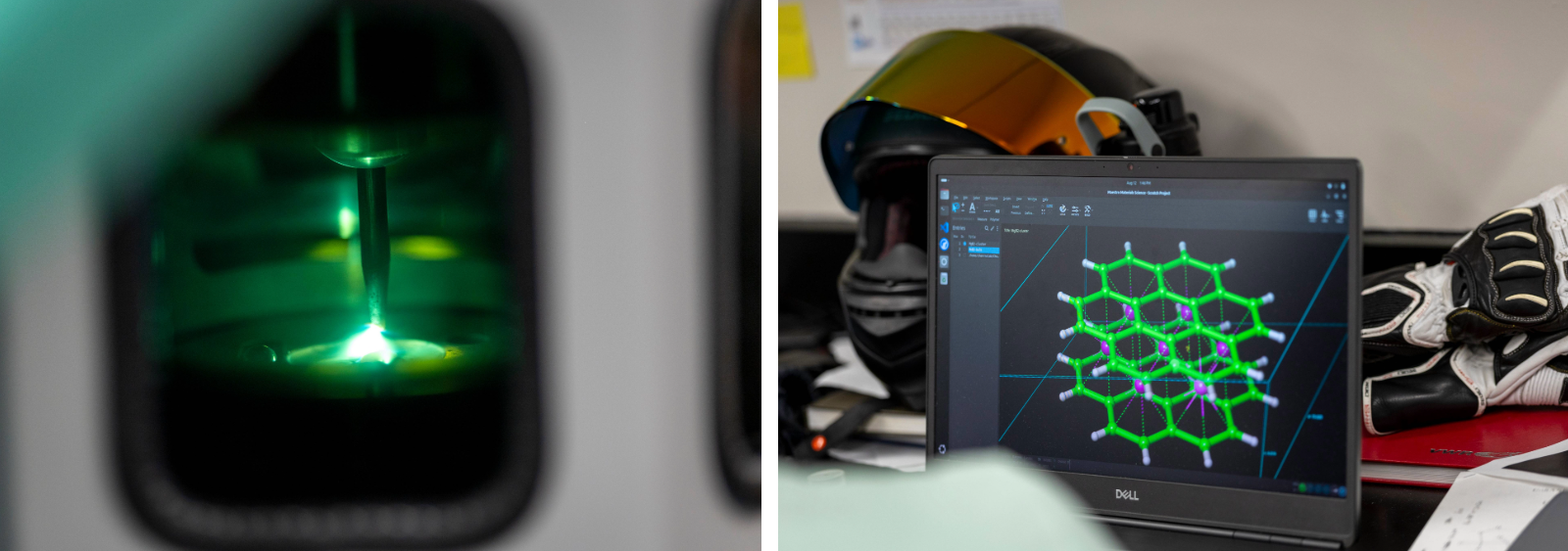 The Yeung Lab’s arc melter synthesizes manganese diboride. Right: Molecular model of manganese diboride. (Photos by Brian Busher)