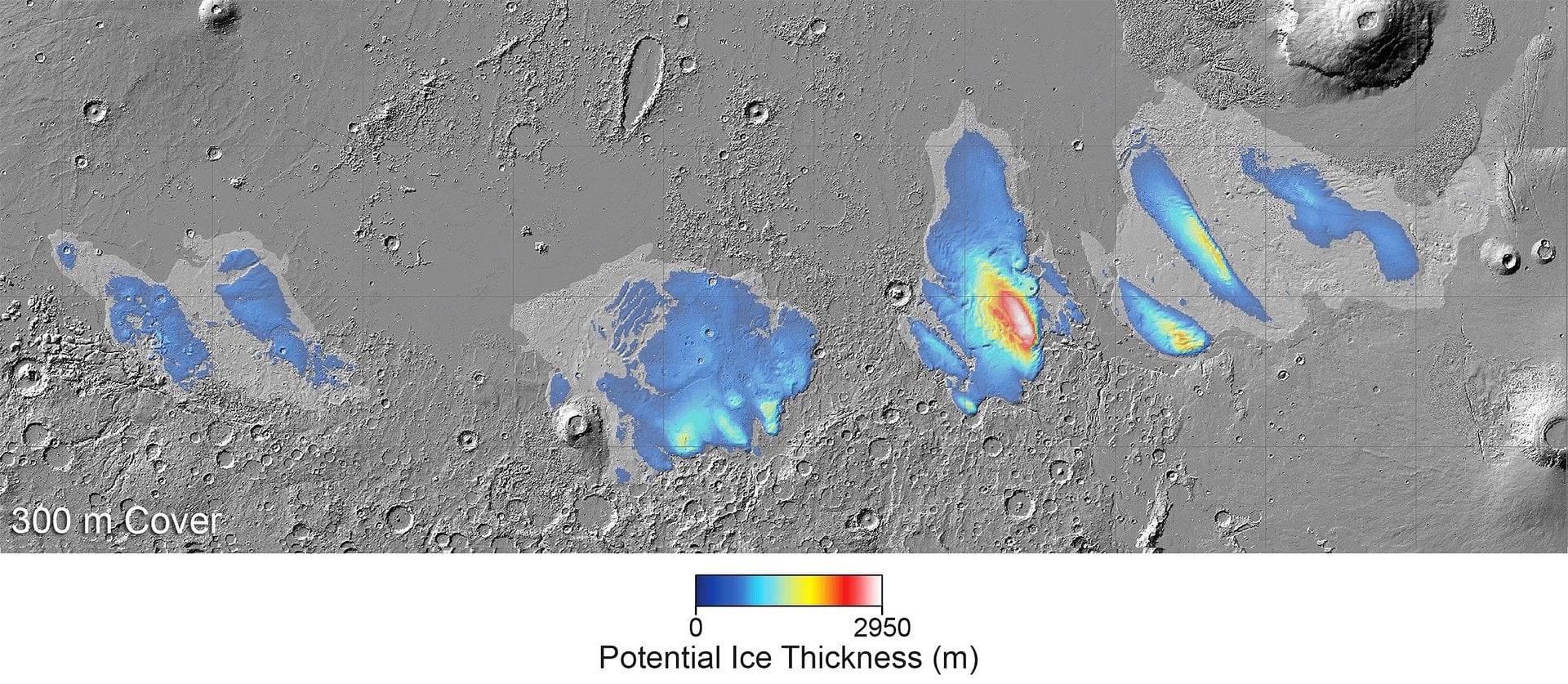 This map shows the ice thickness at Mars’s Medusae Fossae Formation (MFF) if we assume that the dust is 1000 feet thick. In this case, the total volume of water ice contained within the MFF deposits, if it melted, would be enough to cover Mars in an ocean of water approximately 3 metres deep (Credit: ESA)