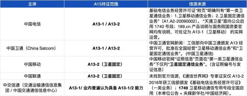 Currently, according to public information, only five companies in the table hold the A13 license, and only China Telecom, China Satellite Communications, and CCCC Information Technology hold the A13 – 1 license.