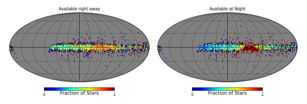*This figure from the research shows the results of placing 100,000 CCSN at a random time of the year and in random locations in the Milky Way. Left: Fraction of stars that explode at night and are available to observe (Available right away). Right: Fraction of stars that explode during the day but are available at night (Available at Night). Image Credit: Banovetz et al. 2026. OJA*