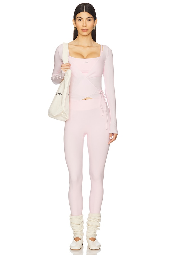 This baby pink three-piece set is a total dream. The V-shape detail on the leggings creates a flattering silhouette, while the coordinating sports bra provides just the right amount of support. Layer on the matching wrap top to pull the whole look together.