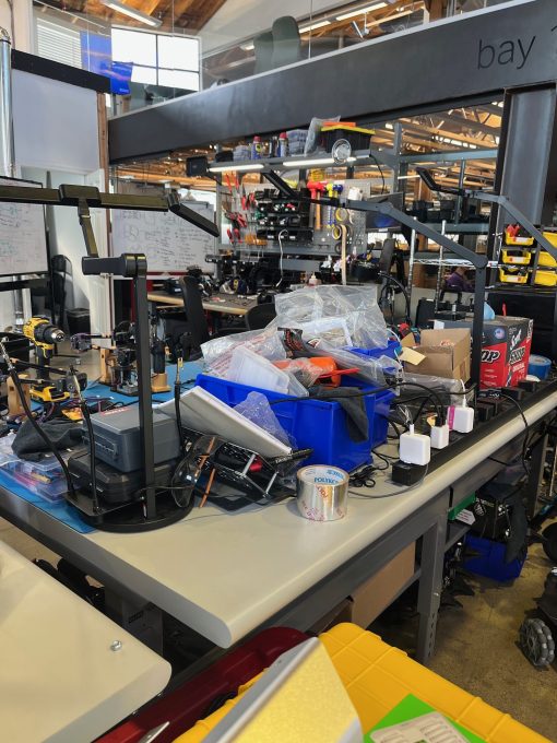 Inside, the space is a giant concrete box made slightly less austere by a haphazard sprawl of long blonde-wood tables. Some are clearly meant for lunch, dotted with Girl Scout cookie boxes, jars of Vegemite (someone here is Australian), and small wire baskets stuffed with one too many condiments. The rest of the tables tell a different story entirely. Many more of them are laden with monitors, spare robotics parts, tangles of black wire, and fully assembled robotic arms in various states of attempting to master the mundane.