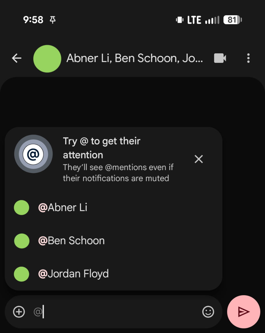 This ability to get a person’s attention in group conversations even “if their notifications are muted” has been slowly seeing a broader rollout in recent weeks. It’s not yet widely available.
