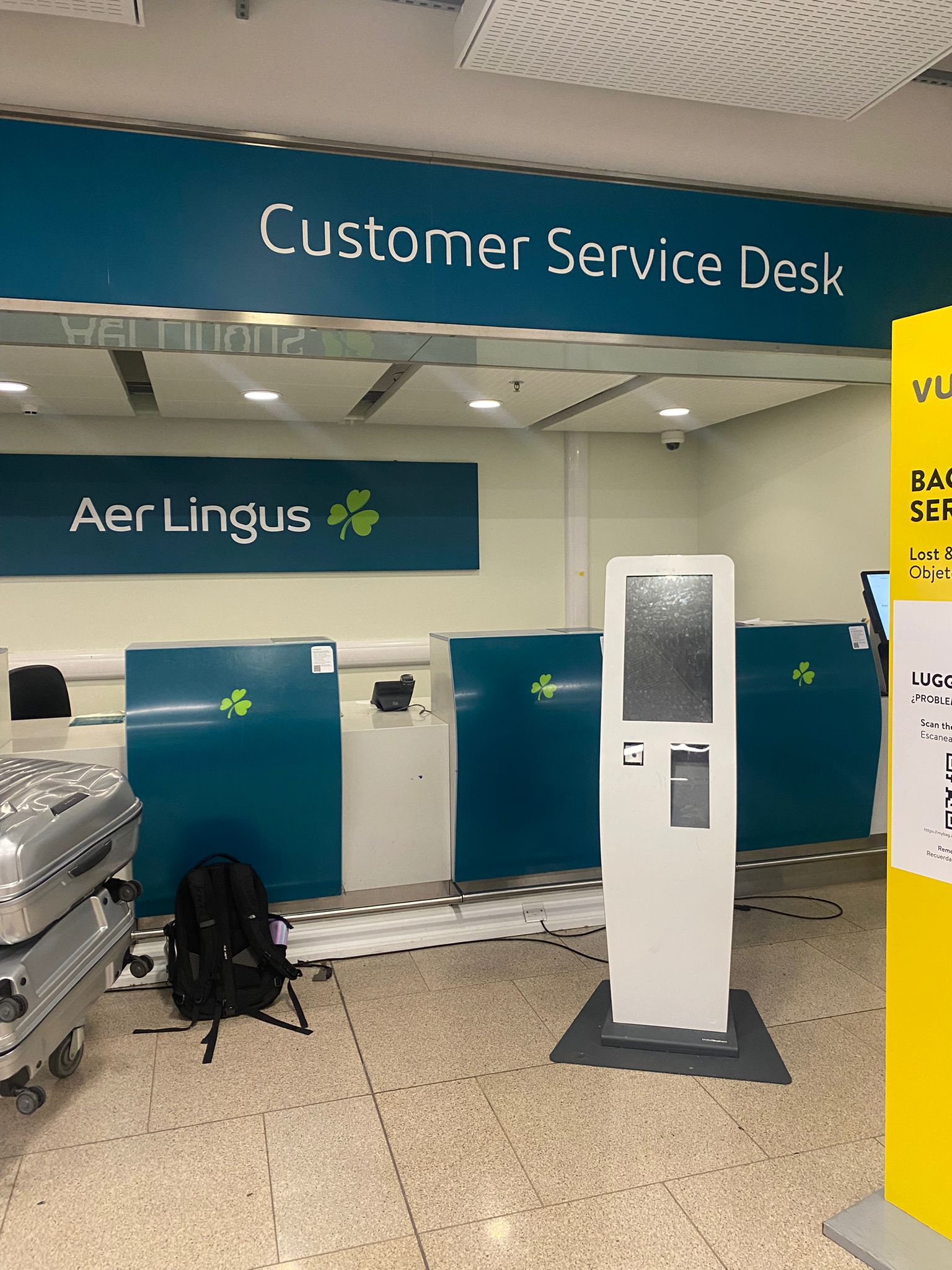 Customer service, allegedly, with not a single human person to take our query. We flew Aer Lingus and they are usually very good. The staff are wonderful, my husband flies with them to London for work. But they damaged the luggage and the car – seat came out in half. These things happen but when we went to lodge the complaint, it was to a machine. Progress, I’ll be told, but how many people have these machines put out of a job? It is just so impersonal.