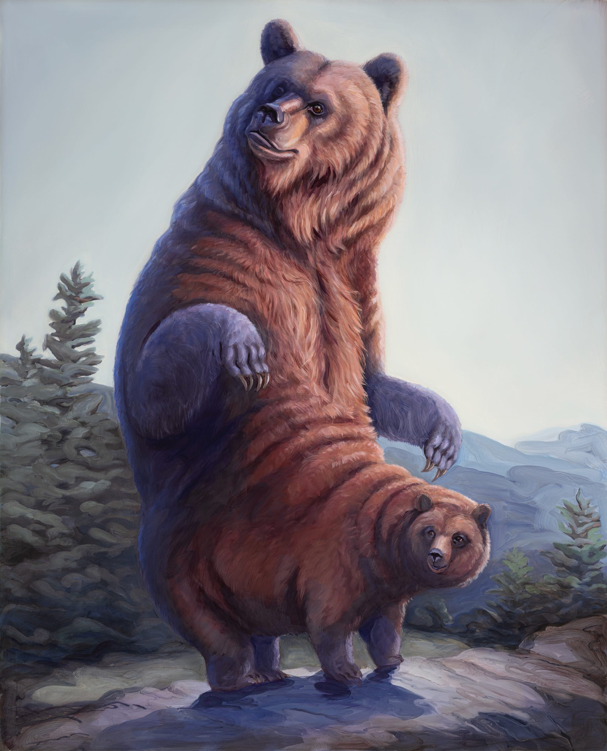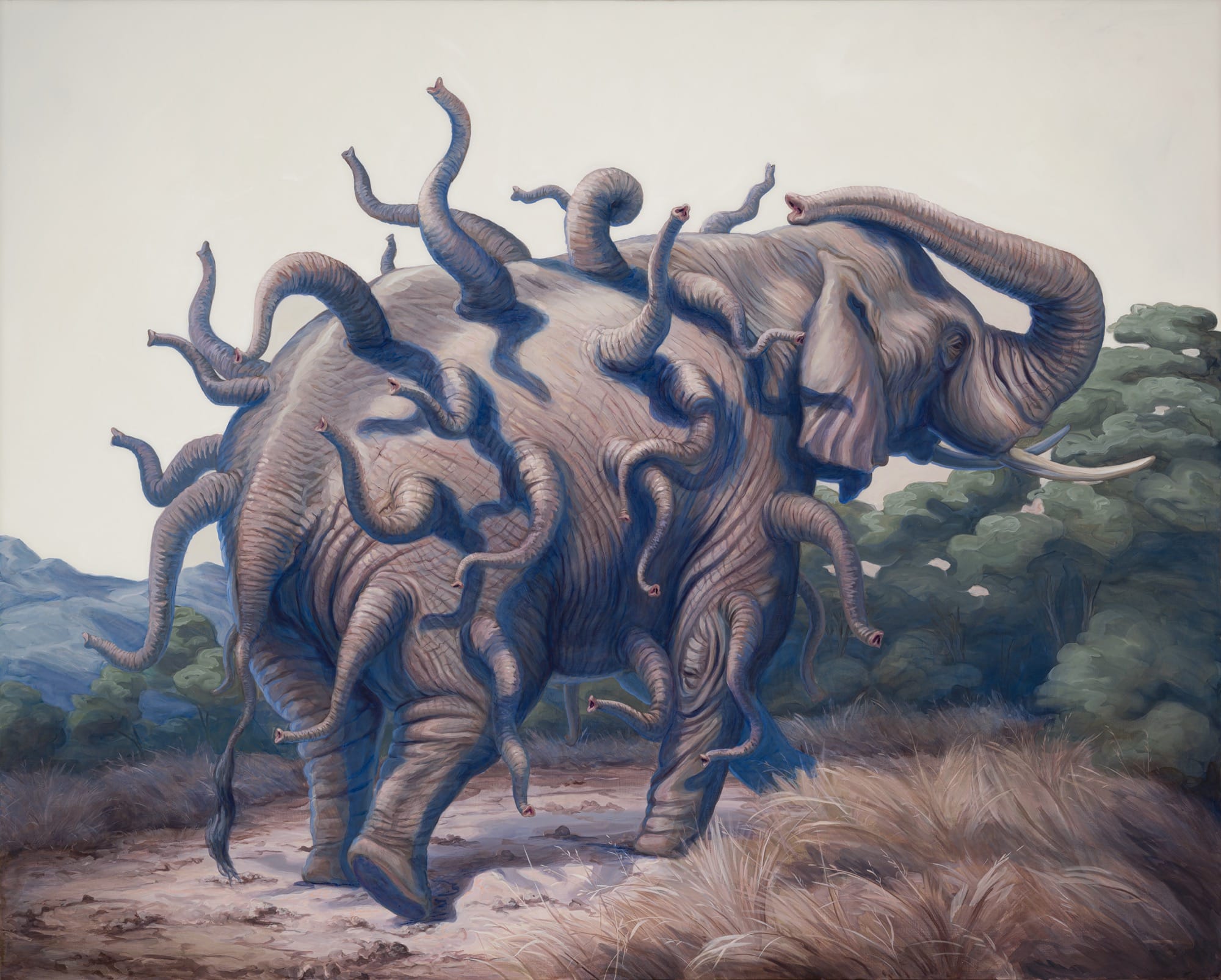 There’s something inherently disturbing about an elephant with a body cloaked in trunks or a giraffe with multiple heads and limbs jutting out in all directions. Despite their bucolic settings and generally calm or curious demeanors, as if nothing is amiss, Pontiroli’s paintings evoke a slight sense of dread. What have we done to cause this?