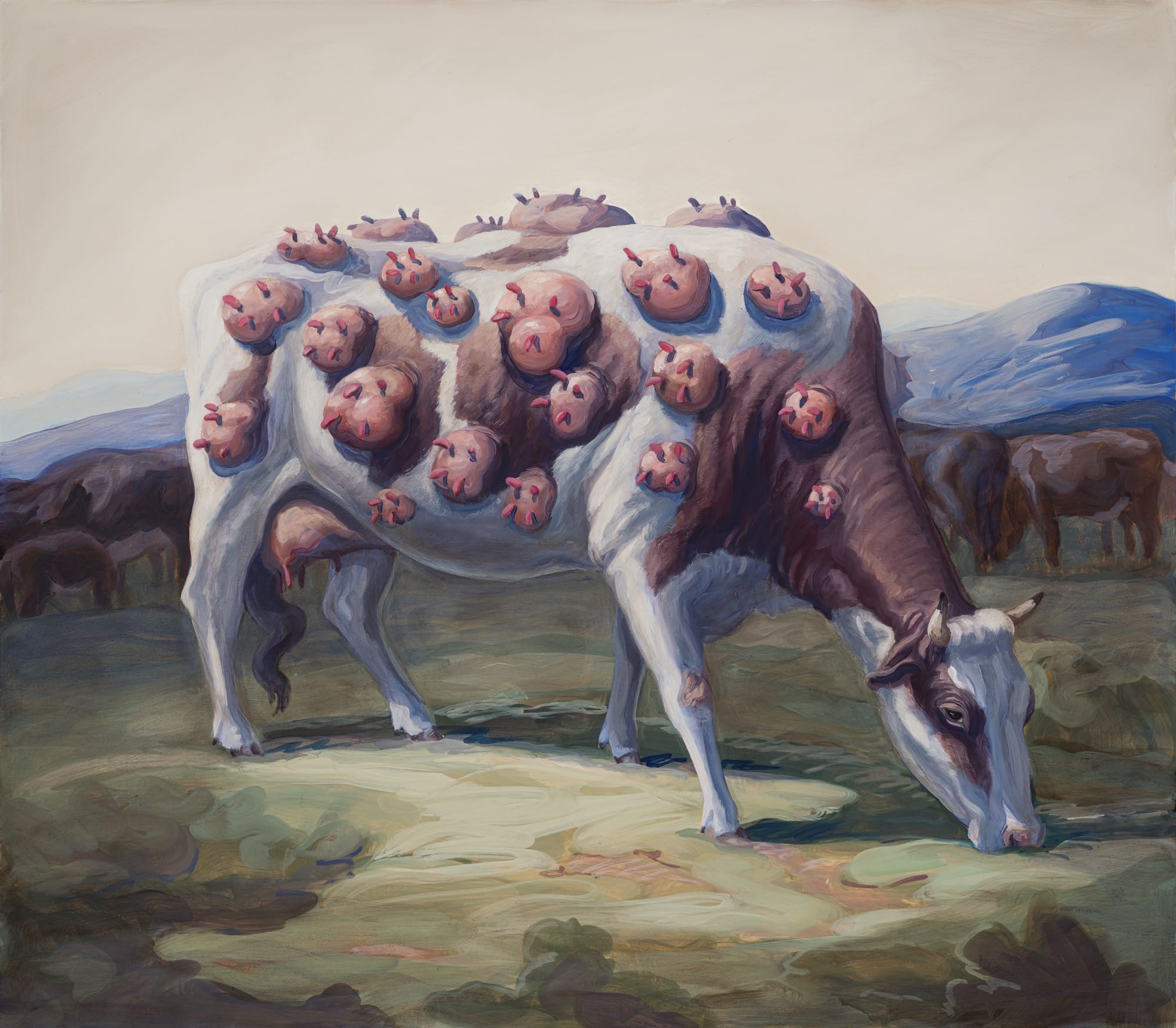 The artist is known for his absurdist paintings of animals with overly long legs, contorted bodies, or myriad mutant-like heads or limbs. They’re often set amid woodlands or meadows evocative of 18th- and 19th-century academic landscape paintings or depictions of formal hunts. Instead, both domesticated and wild animals graze as normally as they would without dozens of heads or udders attached in unnatural places around their bodies.