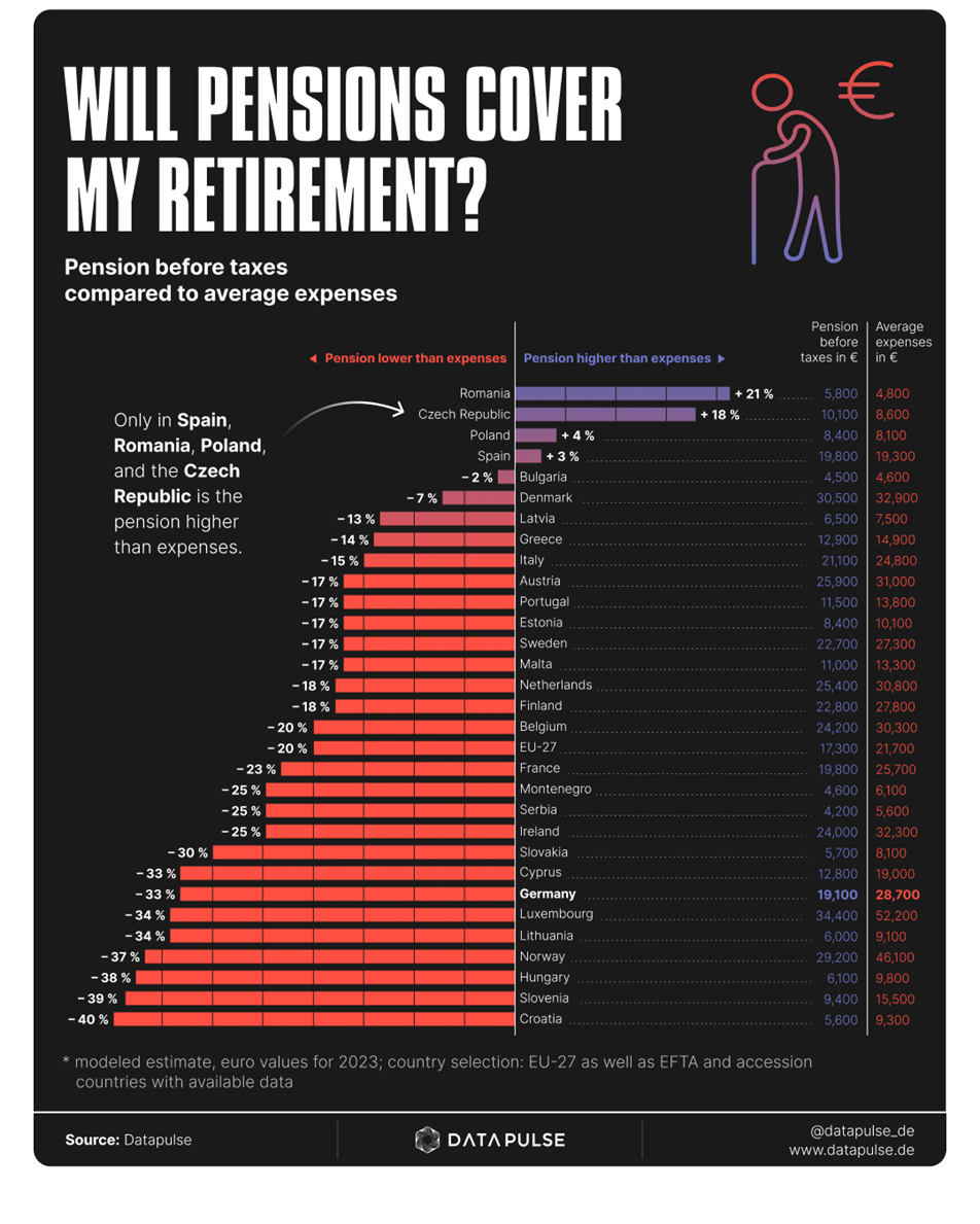 Datapulse.de compared the average state pension with the actual annual expenditures of people aged 60 and over in a Europe-wide analysis.