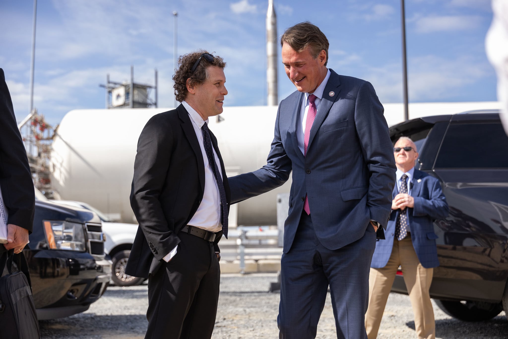 Rocket Lab CEO Peter Beck, left, speaks with Virginia Governor Glenn Youngkin during an event to celebrate the opening of the company’s new launch complex. (Rocket Lab)