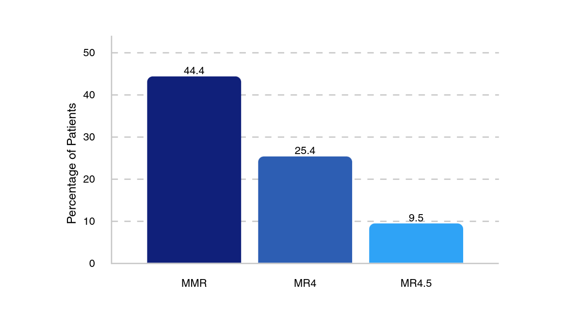 The interim analysis, including 63 patients evaluable for week 24 efficacy, showed high molecular response rates. At week 24, 82.5% of patients had a BCR::ABL1IS level less than 1%. The primary end point, major molecular response (MMR), was achieved by 44.4% of patients. Deeper molecular responses were also observed, with 25.4% achieving MR4 and 9.5% achieving MR4.5 at this early time point.