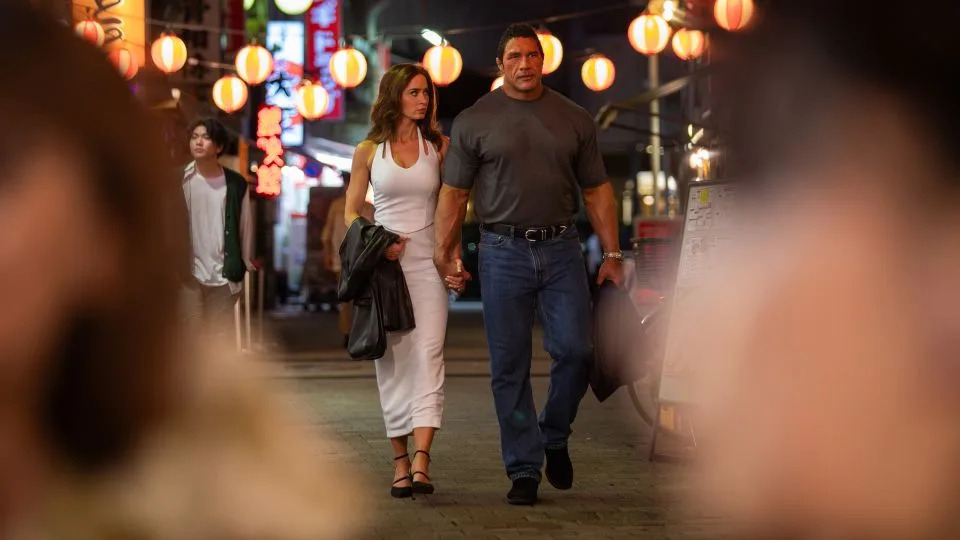 Emily Blunt and Dwayne Johnson in “The Smashing Machine.” – Ken Hirama/A24