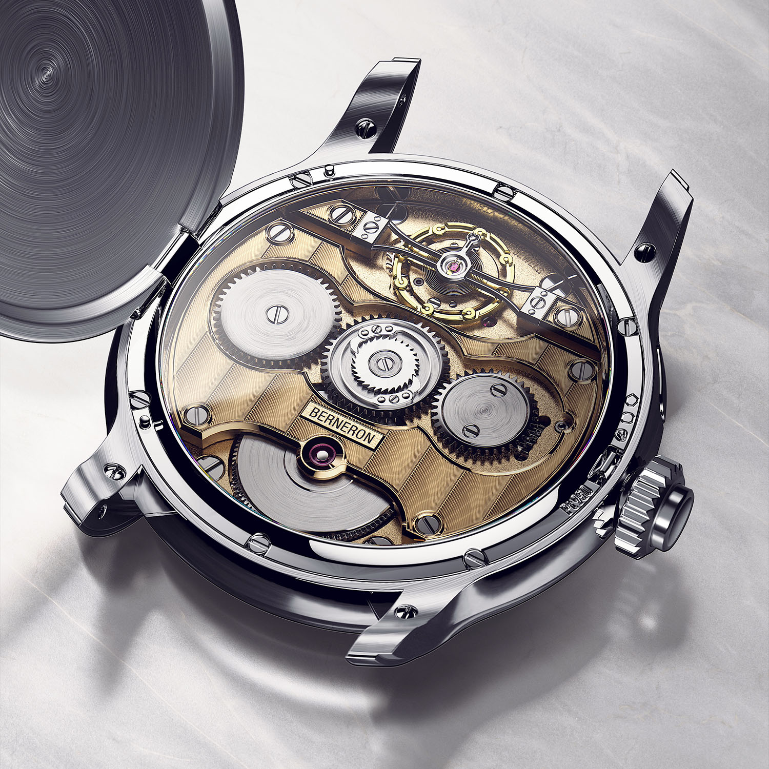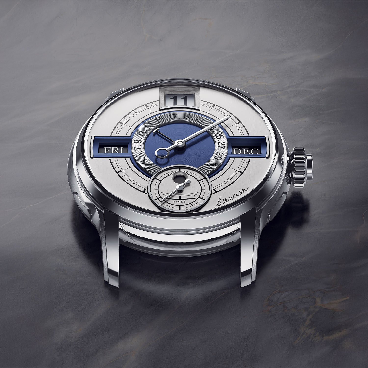 Two editions of the Berneron Quantième Annuel will be produced, one with a black dial and silver-grey accents, one with a silver dial and blue accents. The dial itself is made of solid gold, with gold hands. But what strikes most is the display, with legibility in mind. It’s actually designed as a cross architecture, with vertical timekeeping indications and horizontal calendar elements. As for the time, the regulator-style layout of the Quantième Annuel relies on a large jumping hour at 12 o’clock, a central minute hand and a small seconds at 6 o’clock.