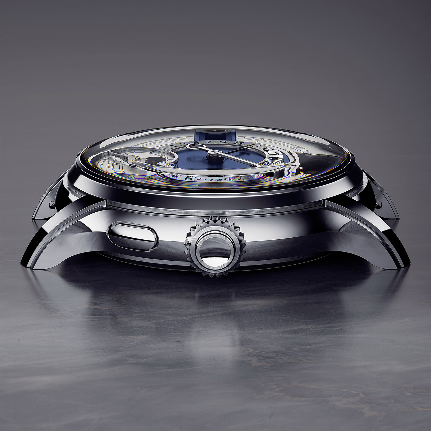 One of the key features of the case is its construction, named Steel Layer. Most of the case, for 85% of its total weight, is made of 950 platinum. But to overcome the weaknesses of platinum, being easily scratched but tedious to repair, the case comes with a protective layer of 904L steel on the most sensitive parts to increase its longevity. This layer is composed of six distinct components (over the bezel, lugs and on the crown), all removable and replaceable throughout the life of the piece. The watch is also equipped with a classic crown and two pushers located at 4 and 8 o’clock, acting as correctors for the day and month jumping indications.