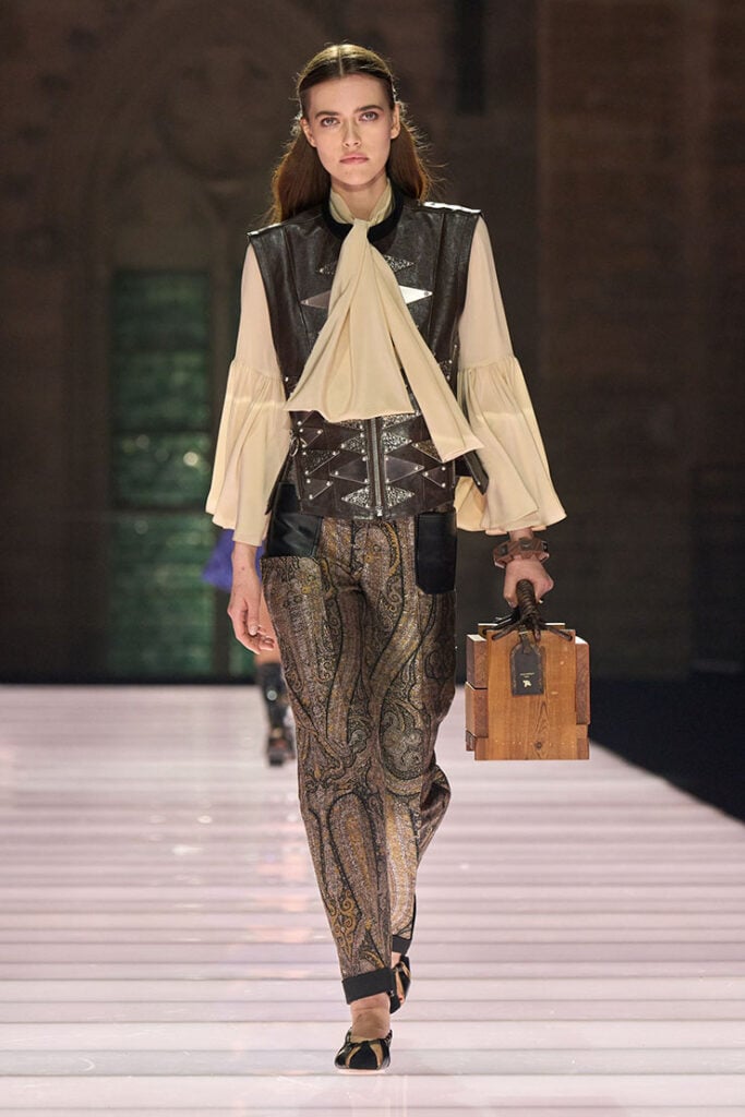 Looking at the runway version of this Louis Vuitton Resort 2026 look, I’m thankful Cate edited it down. She kept just the leather gilet, embroidered with metallic plates and studs, and paired it with sharp black pleated trousers and sleek leather pumps. The original runway styling—with paisley trousers and a blouse—felt a little Captain Jack Sparrow, but Cate stripped it back to something modern, polished, and totally her.