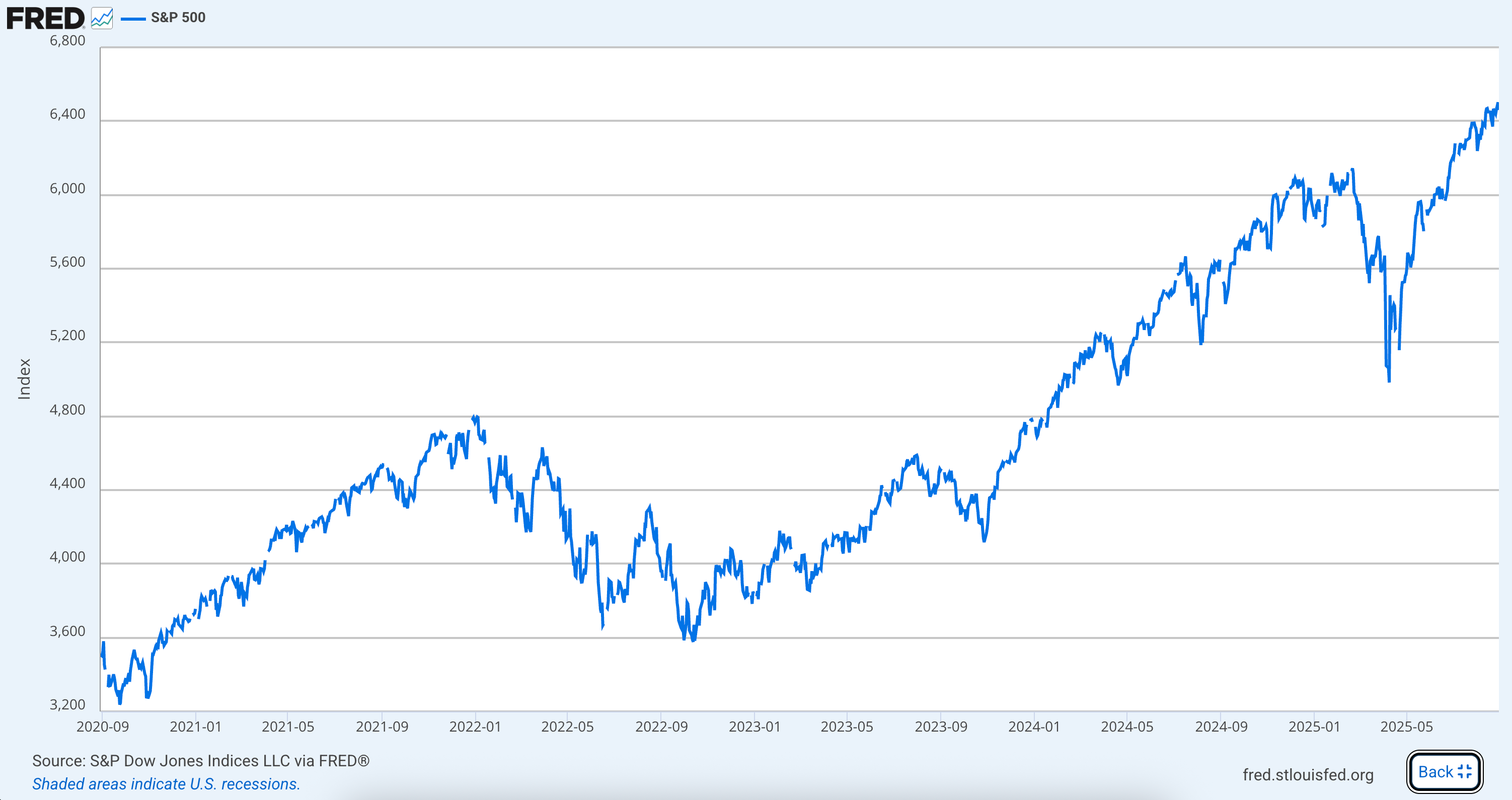 Investors are bullish, the dollar is weaker, and the national debt is mounting—the signals are more mixed than the shouting suggests, Tyler Cowen writes. S&P Dow Jones Indices LLC via Fred