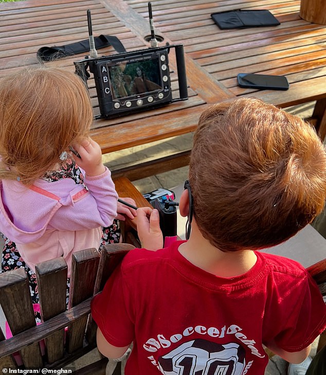 Another photo showed Lilibet with her brother, Archie, six, watching the various camera operations that were rolling as they filmed the show.