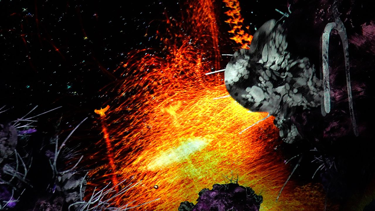 “Massless Amorphous Sculpture” features a floating bubble-like form suspended in a vast space. (© Nippon.com)