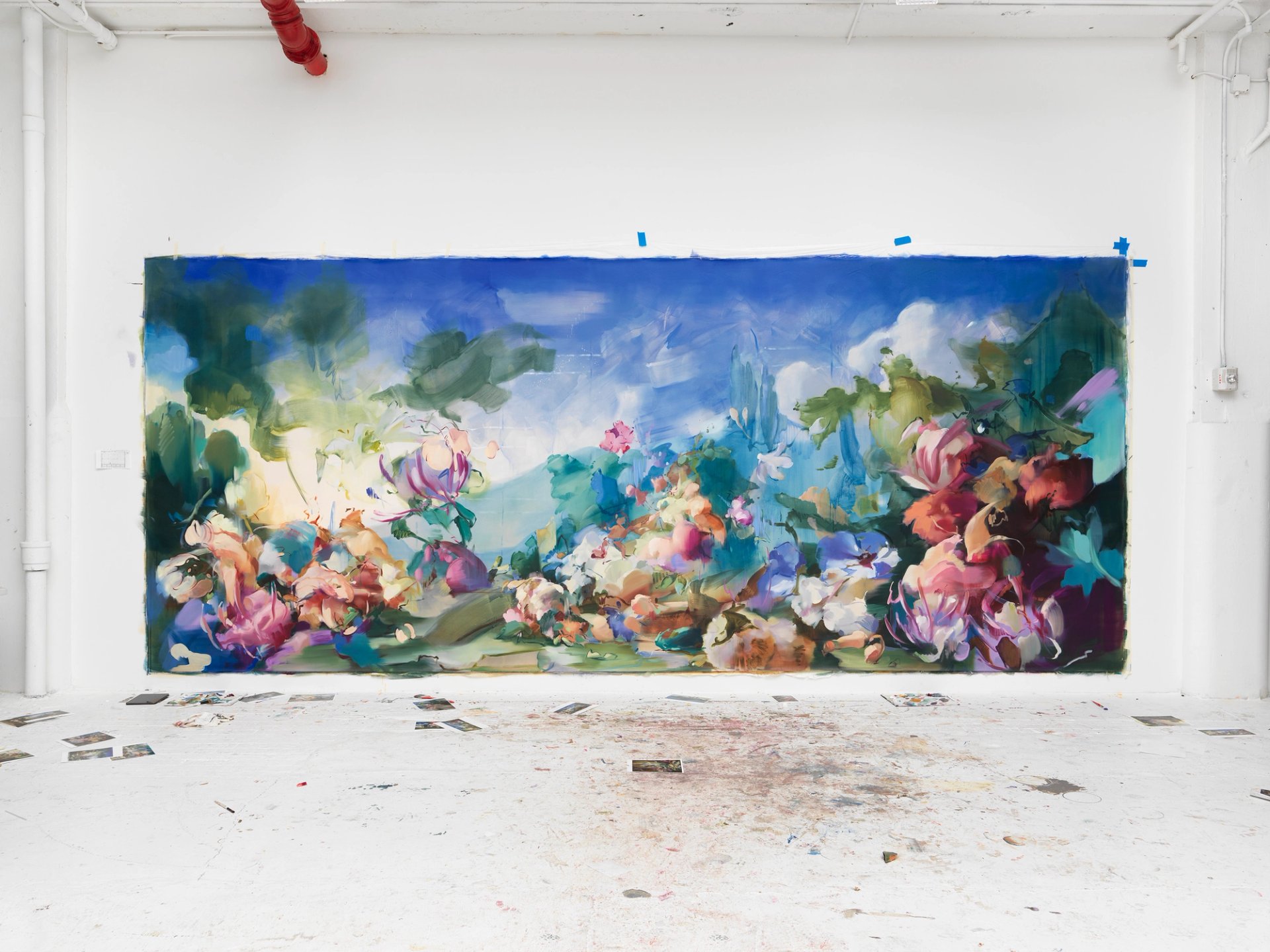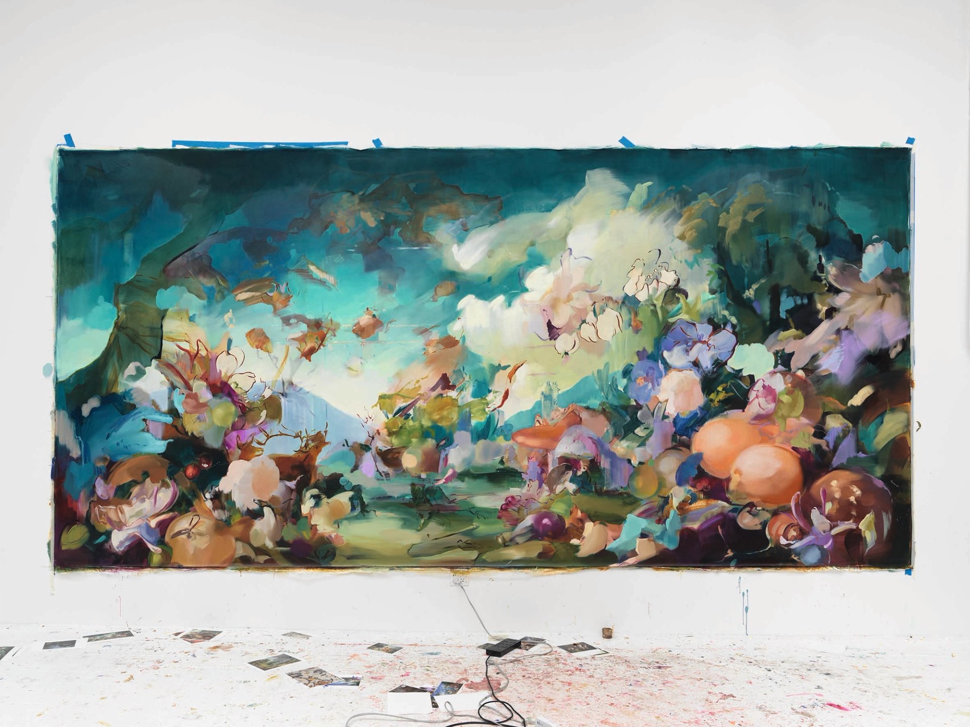 Flora Yukhnovich’s signature large-scale, gestural paintings shot the British artist to fame in the past decade. Riding a wave of popularity for ultra-contemporary painting, her works smashed their auction estimates and sold for millions of pounds. (Her current record was set at Sotheby’s in 2022 at £2.7m.) Yukhnovich, however, prefers not to talk about the market, simply saying “the work is so much more interesting”. And she is not wrong—her sweeping paintings layer references to art-historical movements, from Rococo to Abstract Expressionism, with collages of images taken from a myriad of sources to create fascinating pieces that hover somewhere between abstraction and figuration.