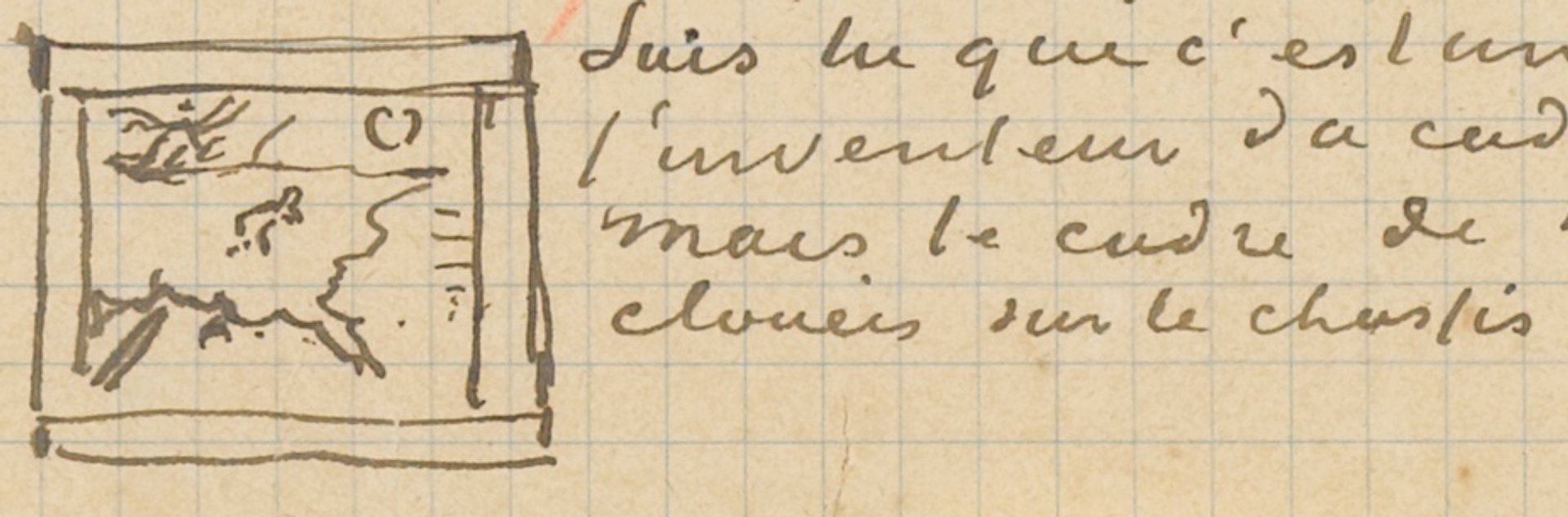 But a fancy gilt frame was not at all what Vincent had intended. In a letter to Theo he gave his own views on framing: “simple strips of wood nailed on the stretching frame and painted.” He drew an accompanying rough thumbnail sketch of the framed painting of The Red Vineyard.