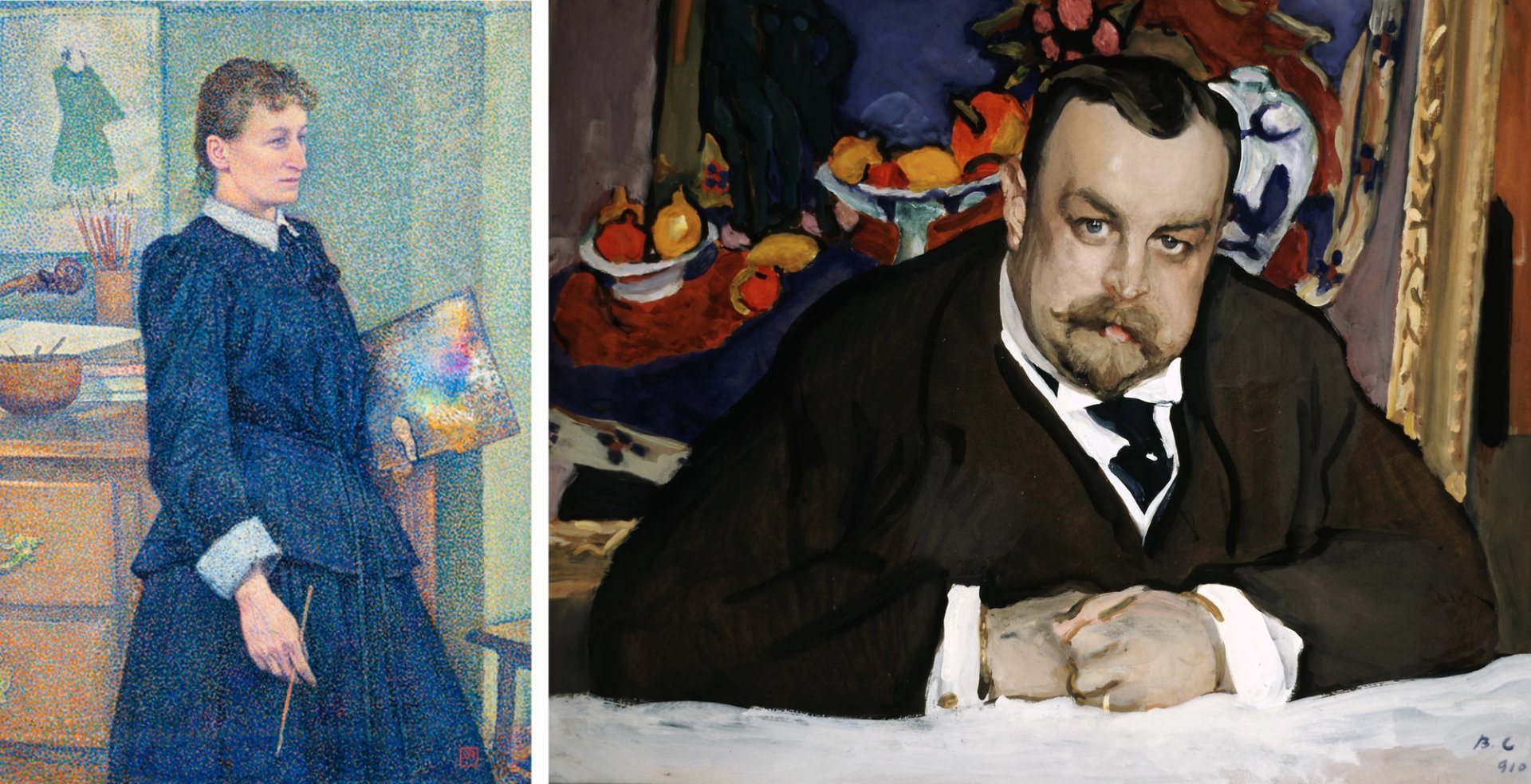 The two early collectors: Anna Boch (Théo Van Rysselberghe’s Portrait of Anna Boch, 1892) and Morozov (Valentin Serov’s Portrait of Ivan Abramovich Morozov, with a painting by Henri Matisse in the background, 1910). Credit: © Michele and Donald D’Amour Museum of Fine Arts, Springfield, Massachusetts; The James Philip Gray Collection (Jon Polak Photography) and Tretyakov Gallery, Moscow
