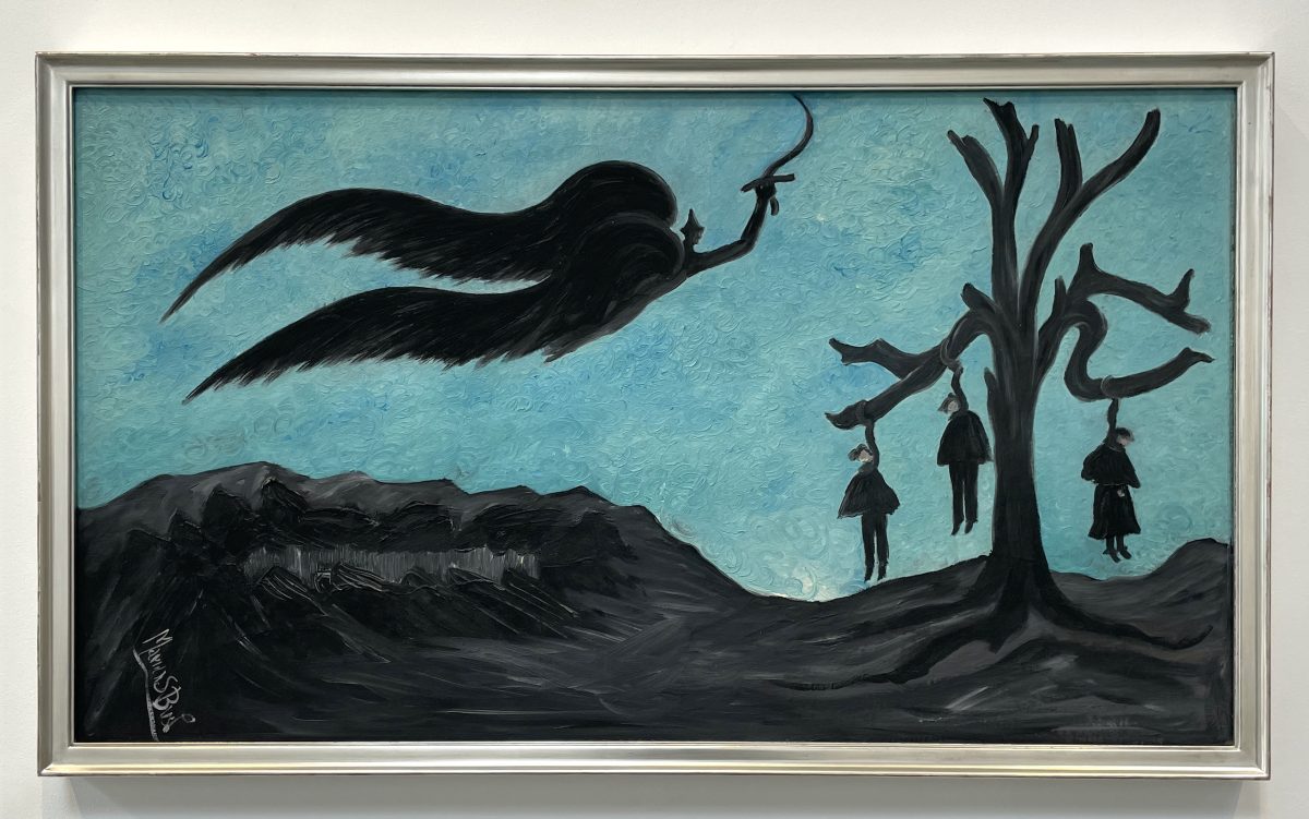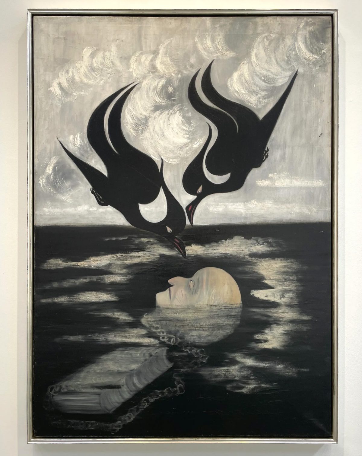 Two similarly striking birds, rendered in black against a cloudy gray sky, nearly meet at the center of “The Pawn Broker (Three Vultures),” from the following year. Below the rigid horizon line is a body of black water. A face, just above the surface, looks up at the birds, fearfully or dolefully; chains are visible around the person’s neck. The show’s standout is “The Avengers” (1943). Here, a winged figure flies close to a dead tree, from which three bodies hang. The dark, undulating ground resembles both earth and water, a stark contrast with the oceanic turquoise sky.